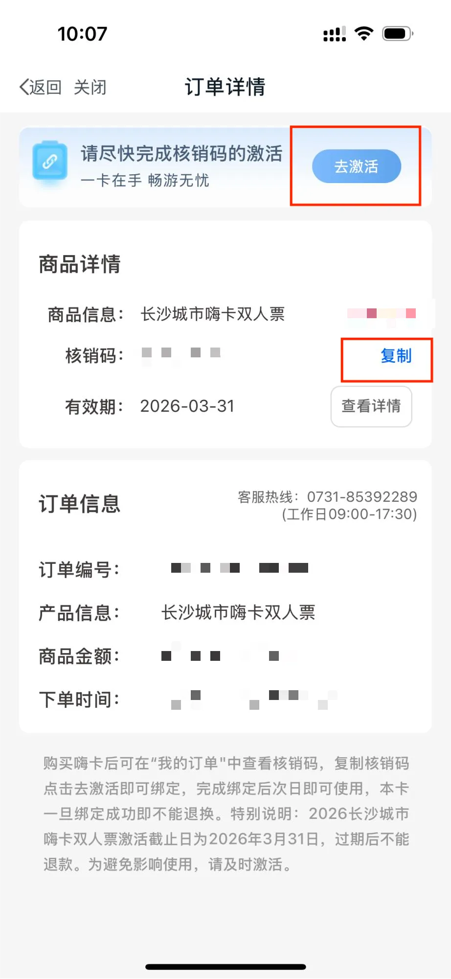 登录“我的长沙”APP,点击首页icon“城市嗨卡”,进入长沙城市嗨卡(2026版)订单页面,复制核销码,点击“去激活”,按流程操作即可。(温馨提示:长沙城市嗨卡是使用持卡者本人身份证实名认证的电子激活卡,预售期间购买的双人、三人卡的用户需在3月31日前激活,单人卡需在2026年10月31日前激活,逾期激活码将失效。一经激活或销售七日以上,不适用于退款规则;部分商家限制仅对女性或特定年龄段开放,详情请查阅各商家资料规则。)