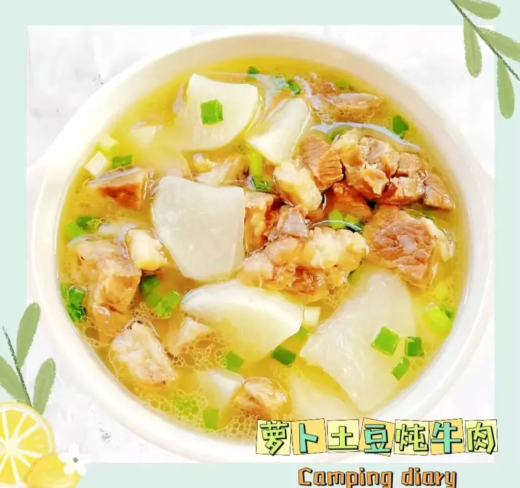 玉米面发糕、牛肉炖土豆萝卜、土豆丝炒芹菜