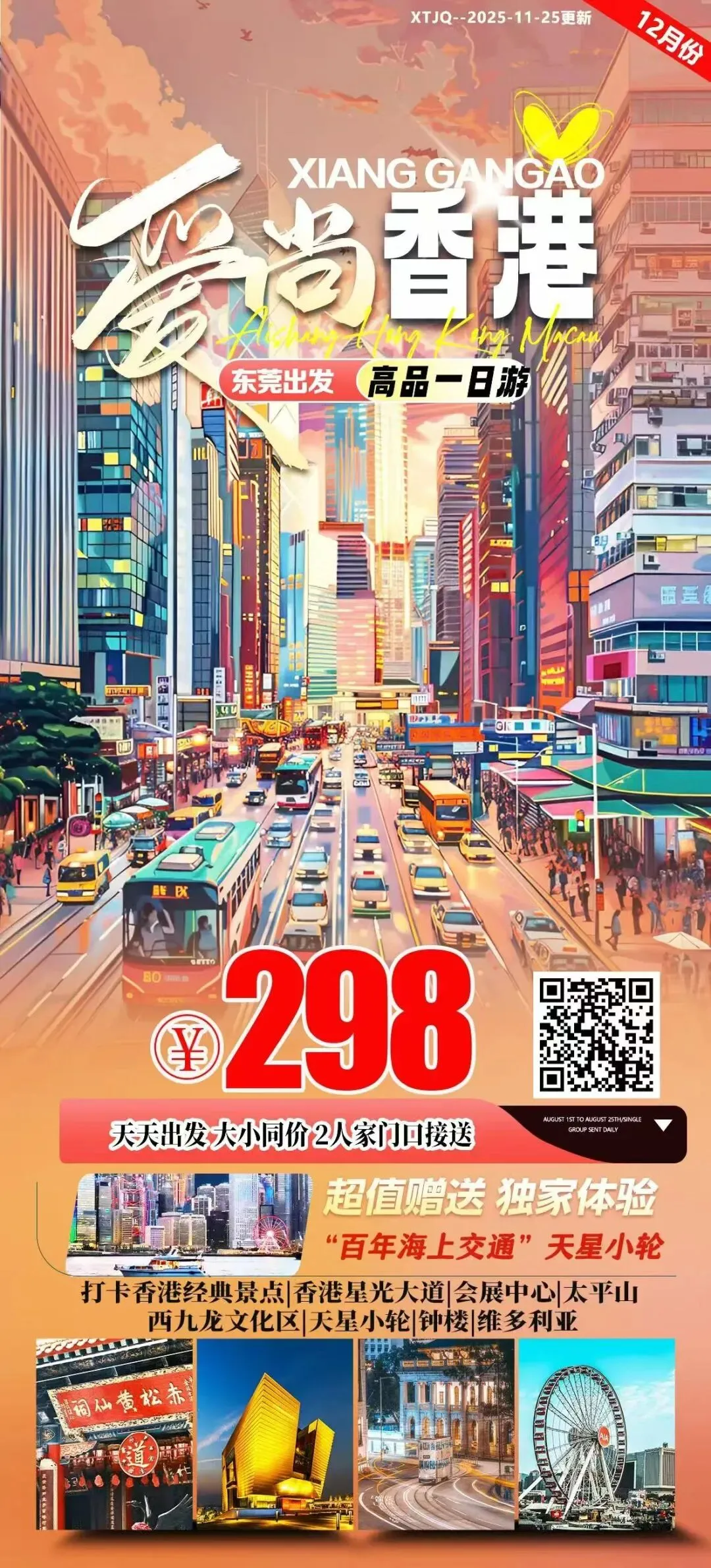 【东莞出发】香港旅游特惠!2026春节前2人起天天出发!人均298!东莞出发香港1日游特惠团!专业香港导游老司机带您畅玩8个香港景点!
