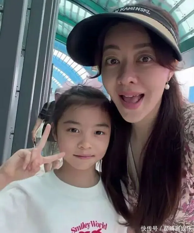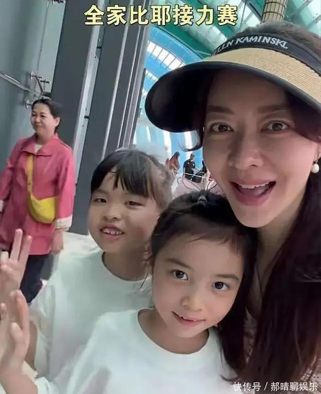熊黛林一家四口旅游,7岁女儿龅牙有点明显,俩娃都不如妈妈好看