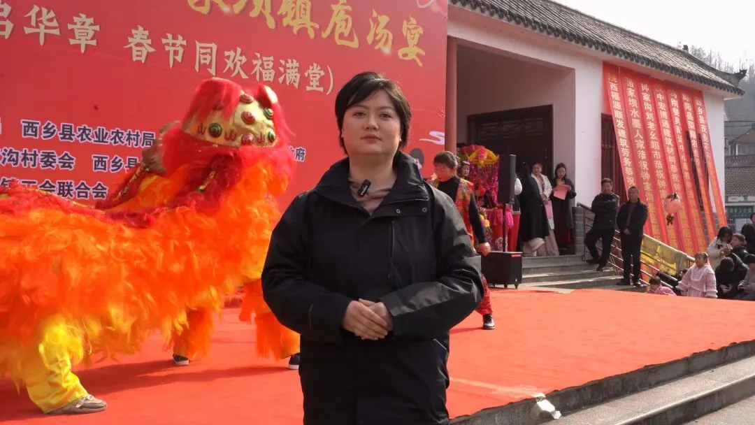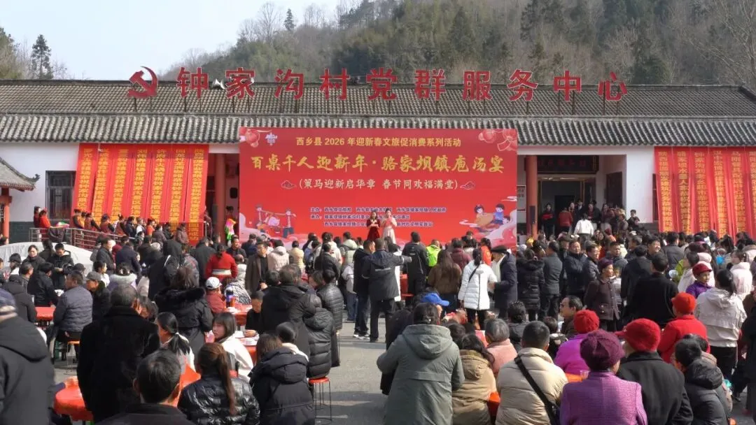 观众朋友们,大家好,我现在所在的位置是骆家坝镇钟家沟景区的百桌千人迎新年,骆家坝镇庖汤宴的活动现场。大家可以看到在我身后人山人海,气氛热烈,乡亲们正围桌而坐,叙家常、品美味。
