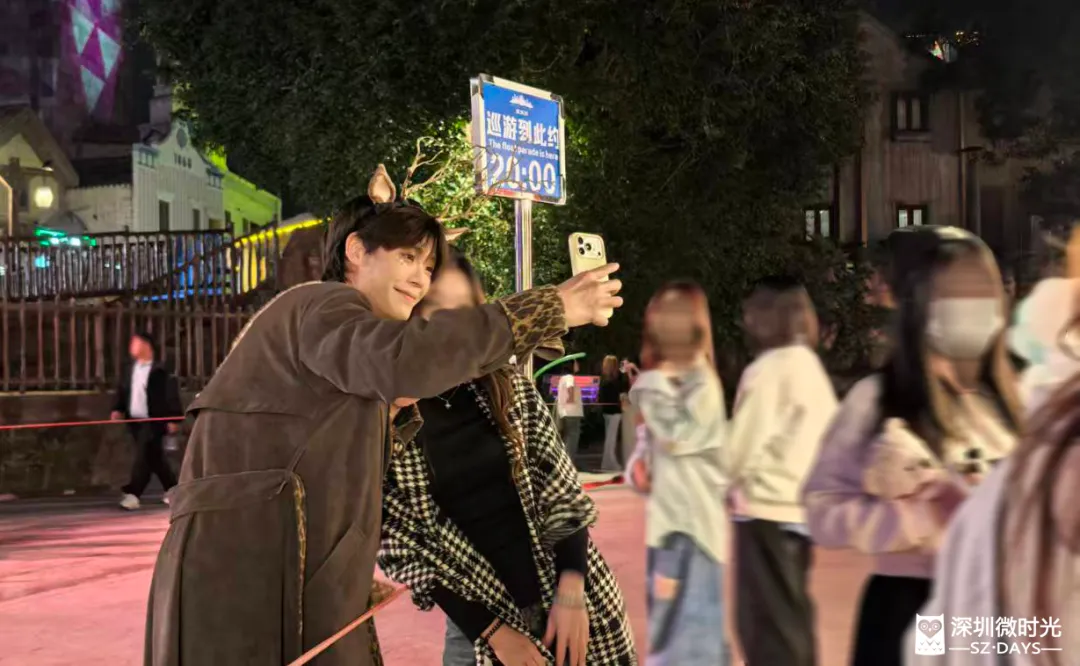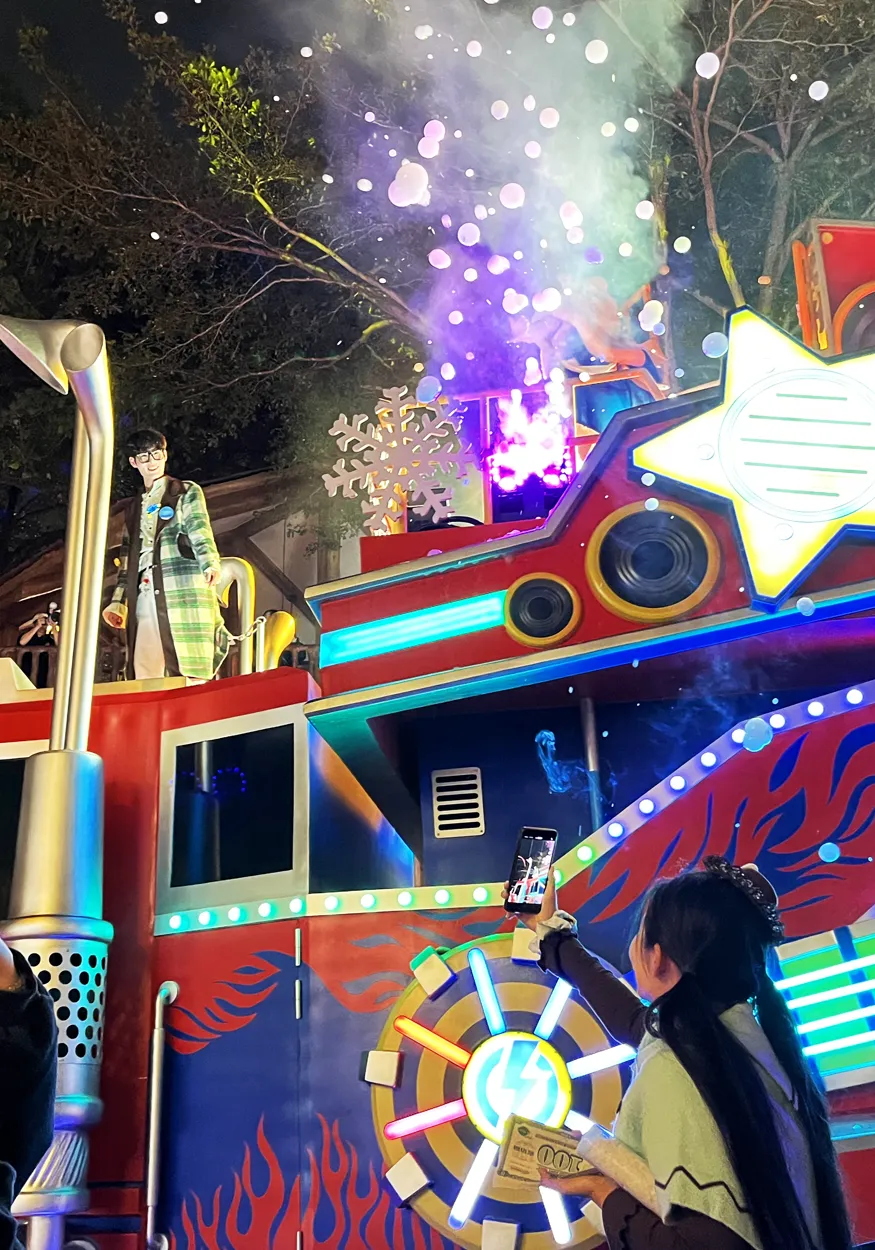 深圳欢乐谷内,NPC与游客互动 为了招揽游客,深圳欢乐谷曾被调侃“五步一男模”,这些男性NPC一度推动园区周末游客数量激增。有些女性游客也会在社交平台上特意艾特深圳欢乐谷,要求某位帅哥NPC返场。 粉丝效应带来的商业价值不止于此。在一部分网红NPC这里,粉丝经济早已是个人生意的一部分。2025年深圳欢乐谷惊奇潮玩节中的一名NPC,在互联网上拥有数万粉丝,除了经营自媒体,他还提供鲜花上门等线下私人定制服务。而在社交平台的讨论中,粉丝给NPC直播间刷礼物、当面送贵重礼物亦很常见。 享受粉丝追捧的同时,高颜值NPC们也有自己的苦恼。随着饭圈文化侵入景区NPC这一领域,部分粉丝对他们的狂热程度已堪比对待流量明星。一些NPC不仅被跟踪,甚至住址与出行轨迹也被泄露,进而遭遇蹲守与骚扰。 不可回避的一点是,如今的大部分游乐园,本身就是一个造梦厂。2025年12月,深圳欢乐谷闪耀欢禧节开启,晚上七点半开始的“冬日浪漫大巡游”,站着俊男美女的花车在园区内徐徐移动,花车前后各有不同角色的NPC,或与观众互动,或在路中央热舞,漫天的人工雪花和泡泡从花车上落下,欢快青春的日文歌在空中飘荡。