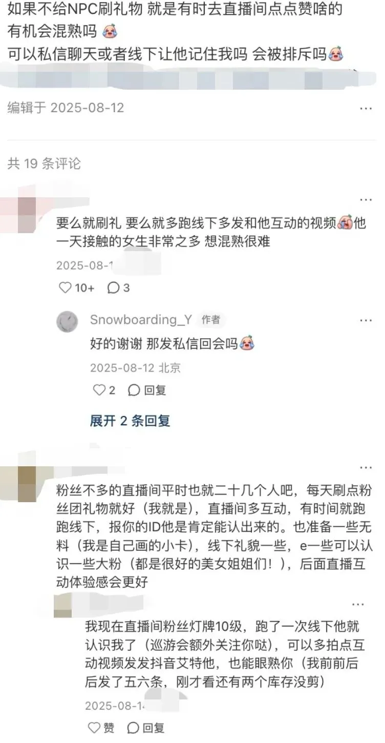 在一部分粉丝的交流中,频繁的金钱供养与精力付出,是被NPC“看见”、获得情感慰藉的途径。有用户在讨论区分享道,“跟自己喜欢的NPC见面,不带东西就感觉自己有罪,不好意思跟他拍照互动。”