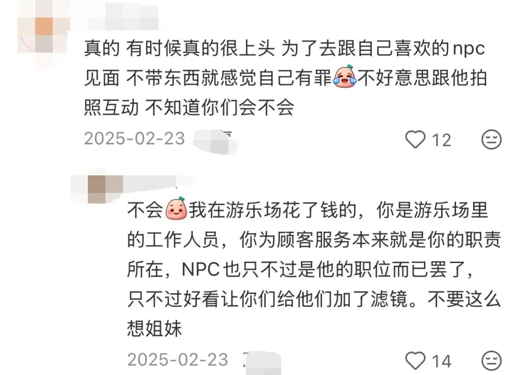 男色消费,还是被男色消费 只是,在粉丝效应带来的商业收益下,这些困扰似乎显得微不足道。 在社交平台上,有一系列很有意思的讨论,主题围绕“现代女性的男色消费,究竟是消费男色还是被男色消费”,游乐园NPC作为近两年男色消费的顶流,也成为这场讨论的中心。 一名发起“NPC受害者联盟”的小红书用户,分享了自己两次跨城与游乐园NPC互动后,对一名男性NPC陷入情感迷恋的经历,她还因此生出了办游乐园年卡的冲动。 更多的用户分享的是“迷上NPC后钱包受伤”的经历。除了办游乐园年卡、频繁跨城追NPC的交通住宿费,有些粉丝在NPC直播间刷礼物累计花费数万元。