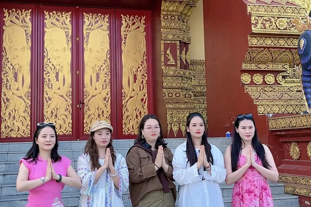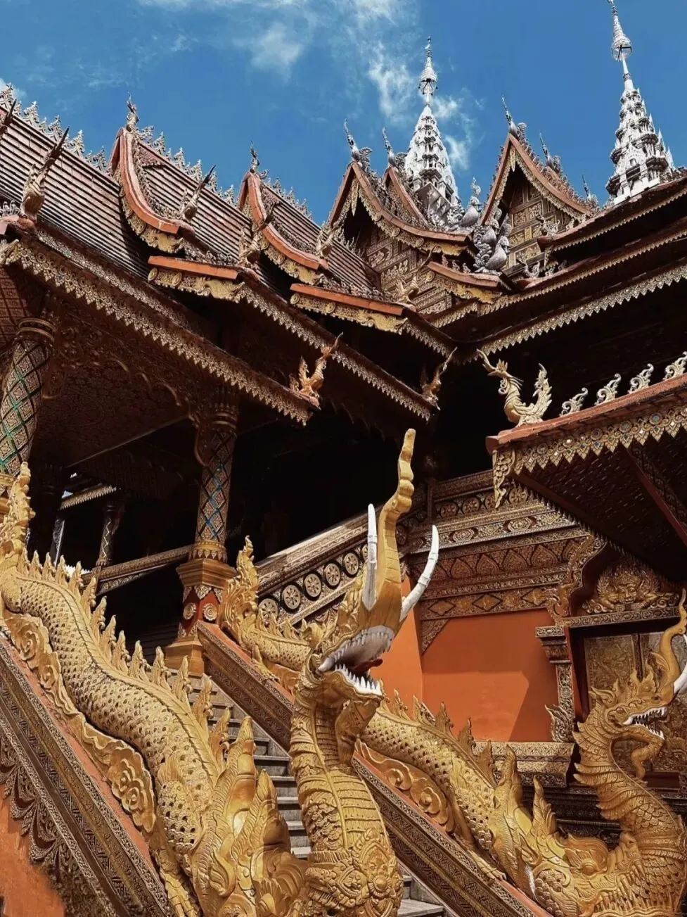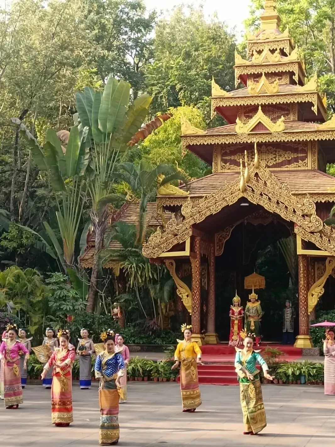 人文风情更是版纳之旅的点睛之笔。古纳卡傣族文化园保留着原汁原味的傣族古寨风貌,佛寺、水井塔等特色建筑错落有致,银器锻造、织布技艺的演示,让大家领略到传统文化的匠心传承;勐泐大佛寺庄严肃穆,夕阳下的佛像与佛塔金光闪耀,随手一拍便是壁纸级美景,让人在静谧中感受南传佛教的神圣。夜晚的告庄星光夜市烟火气十足,五颜六色的油纸伞下,特色商品与地道小吃琳琅满目,尽显版纳的热闹与鲜活。沿途的孔雀宴、象餐、红酒晚宴等特色美食,更是让味蕾全程享受盛宴,体验多元饮食文化的魅力。