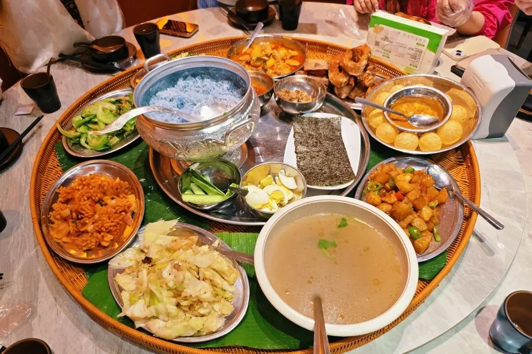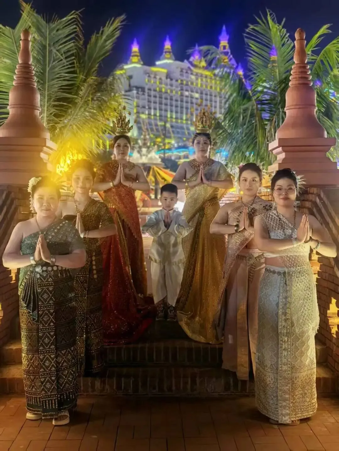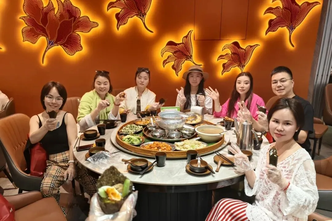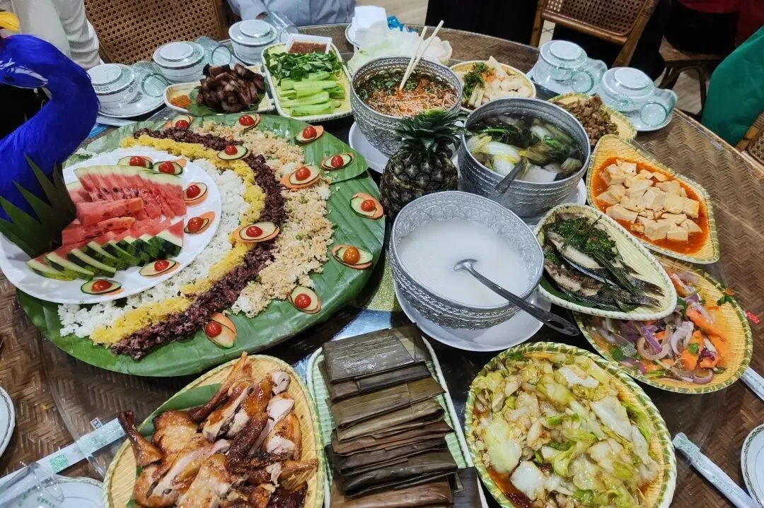 人文风情更是版纳之旅的点睛之笔。古纳卡傣族文化园保留着原汁原味的傣族古寨风貌,佛寺、水井塔等特色建筑错落有致,银器锻造、织布技艺的演示,让大家领略到传统文化的匠心传承;勐泐大佛寺庄严肃穆,夕阳下的佛像与佛塔金光闪耀,随手一拍便是壁纸级美景,让人在静谧中感受南传佛教的神圣。夜晚的告庄星光夜市烟火气十足,五颜六色的油纸伞下,特色商品与地道小吃琳琅满目,尽显版纳的热闹与鲜活。沿途的孔雀宴、象餐、红酒晚宴等特色美食,更是让味蕾全程享受盛宴,体验多元饮食文化的魅力。
