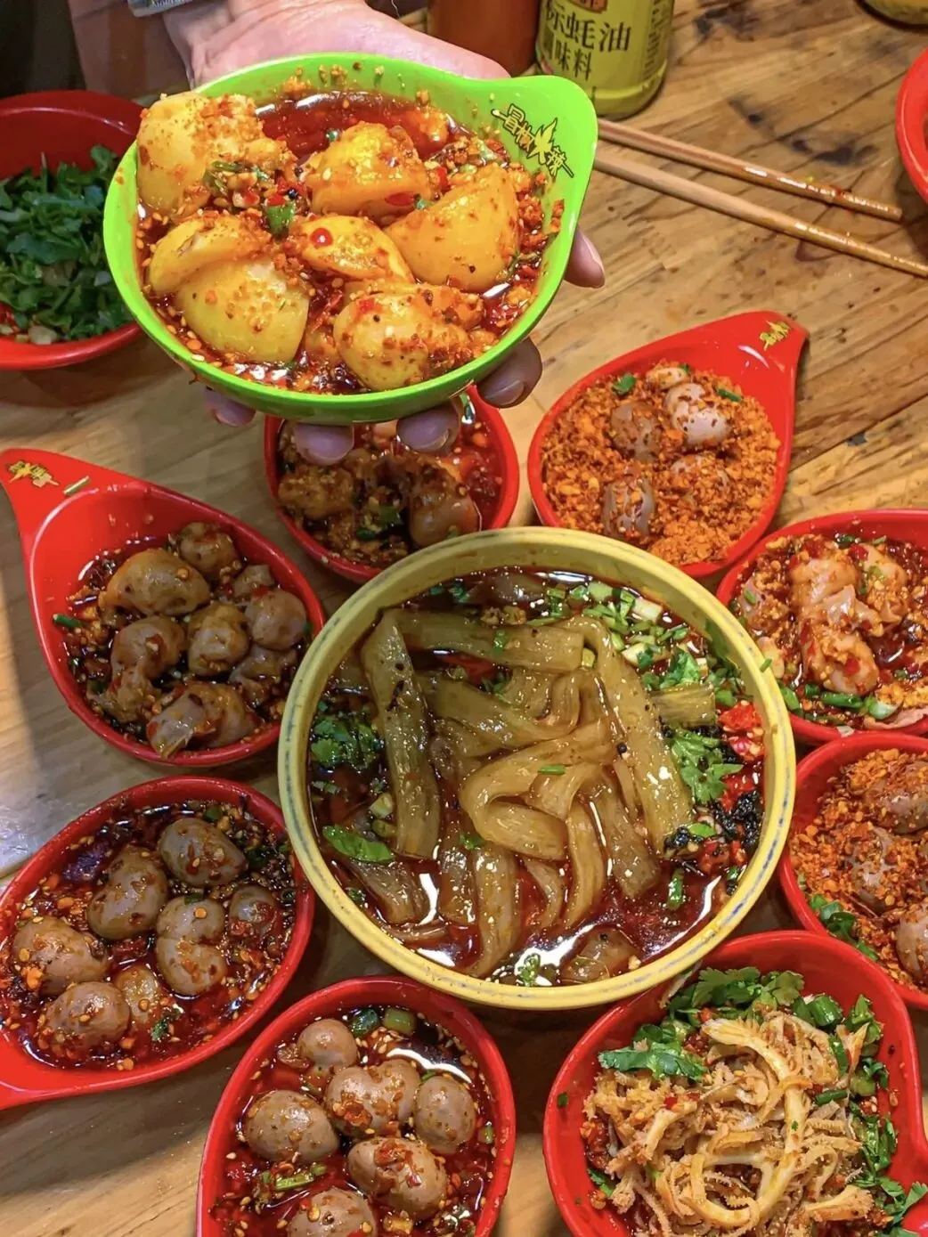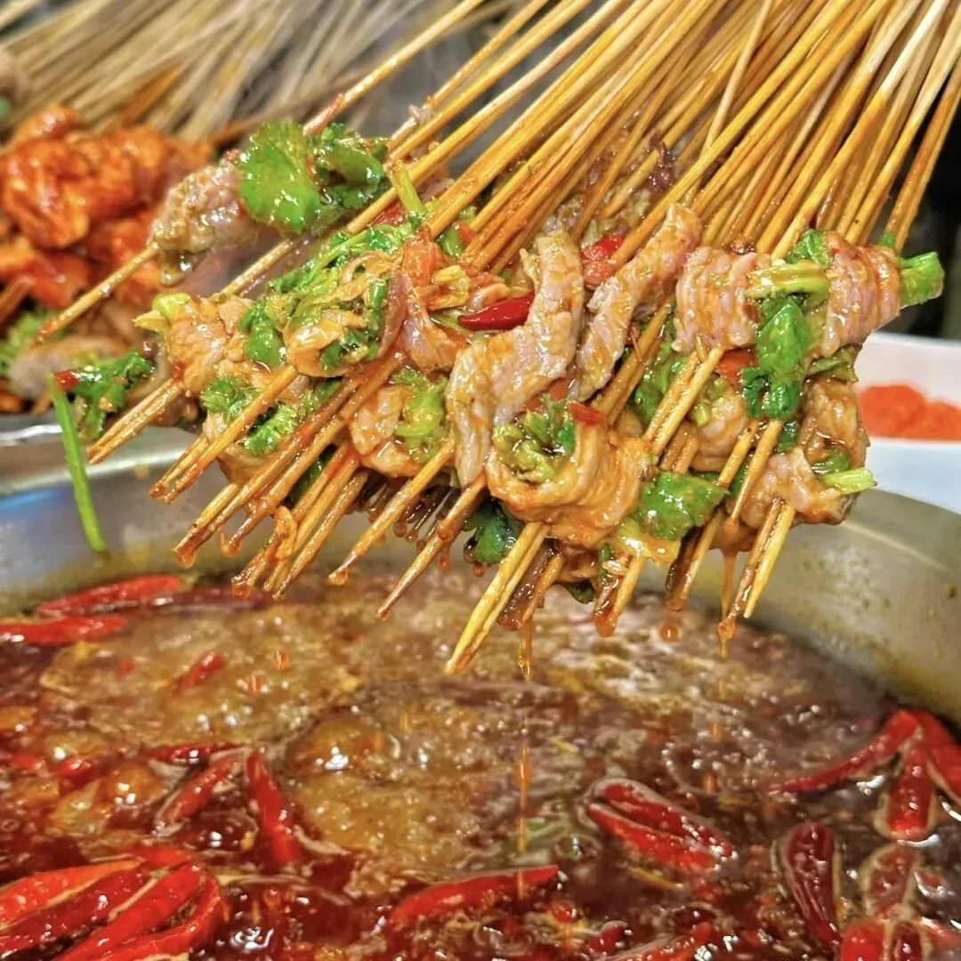 “冒椒火辣”的串串摊前已经排到30号,但等待是值得的。这里的冷锅串串有红油和藤椒两种口味,推荐小郡肝、牛肉和土豆片。最特别的是他们的脑花,用锡纸碗装着,麻辣入味且毫无腥气。