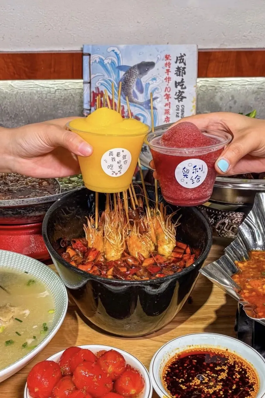 斜对面的“成都吃客”用川菜玩出新花样。那道裸奔坨坨虾上桌时还冒着干冰的雾气,虾已经剥好壳,浸泡在特制酱汁中,省去剥壳的麻烦又保持鲜嫩。