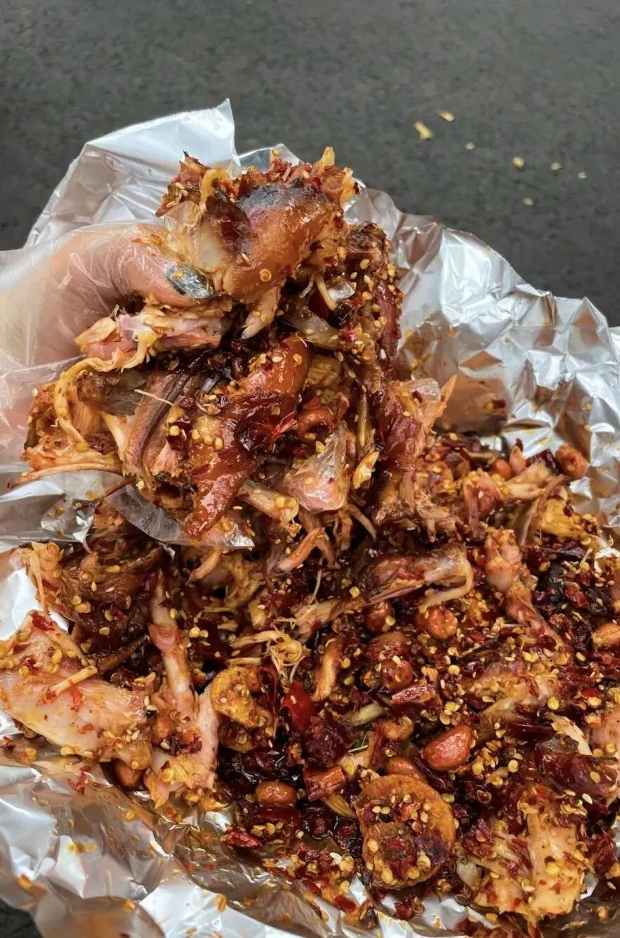 夜宵自然不能错过。打车到玉林西路的“老黄记手撕烤兔”,即使晚上九点,排队的人依然络绎不绝。烤兔外焦里嫩,兔头有五香和麻辣两种选择。成都人吃兔头的精细程度令人惊叹——他们会熟练地将兔头掰开,先吃脸颊肉,再吸脑花,最后才处理下巴。