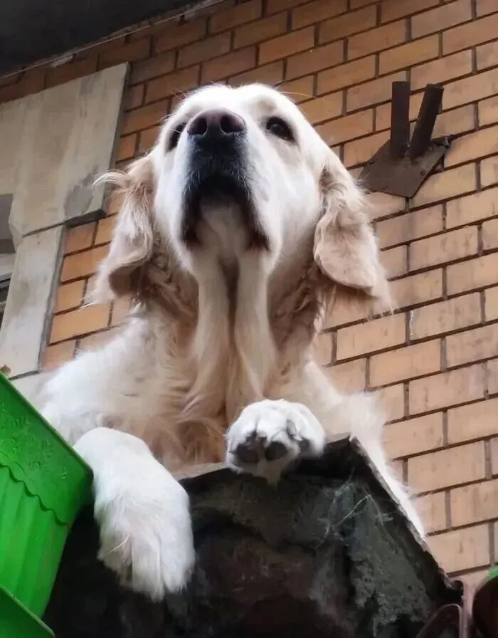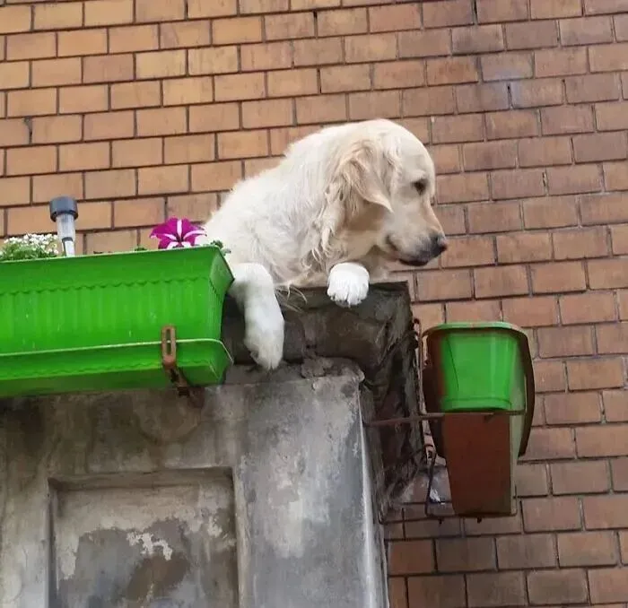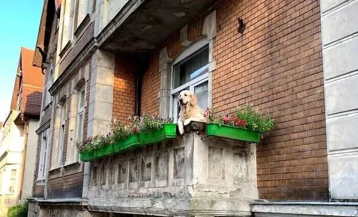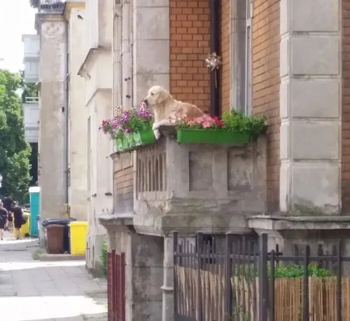 其实就是一只叫米尔卡的大金毛 , 每天趴在自家阳台上看风景 , 阳台开满鲜花 , 它表情特别淡定 , 路人觉得有意思就拍照 , 拍着拍着 , 它就被标记成景点了~