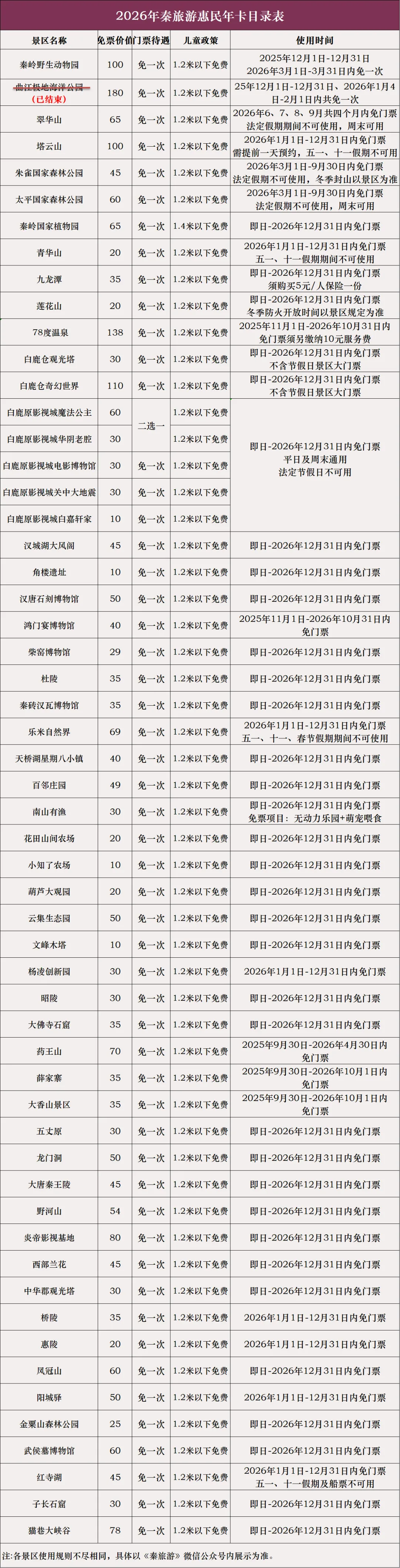 2、待遇:2025年12月1日-12月31日;2026年3月1日-3月31日内持秦旅游年卡免门票限一人次使用。