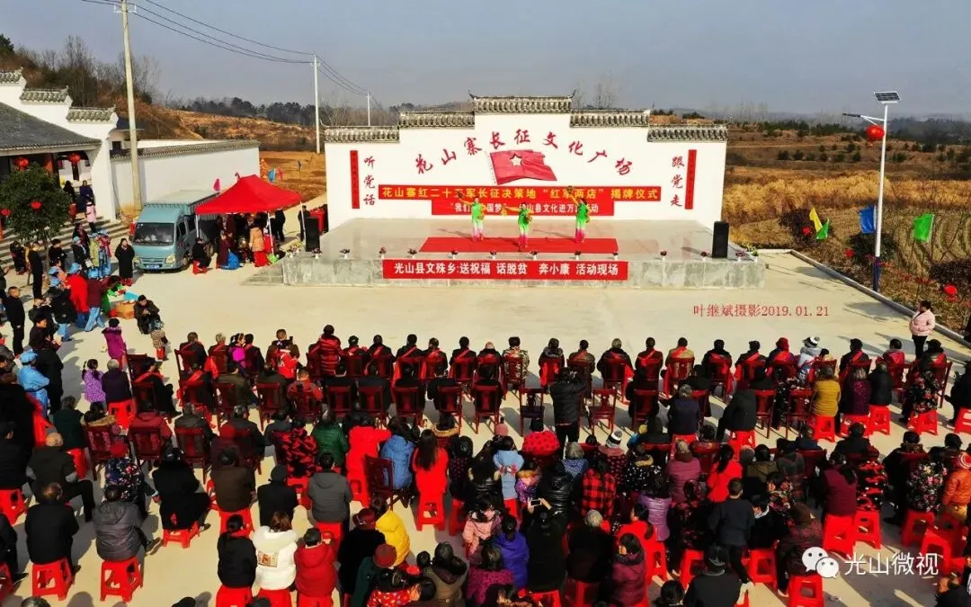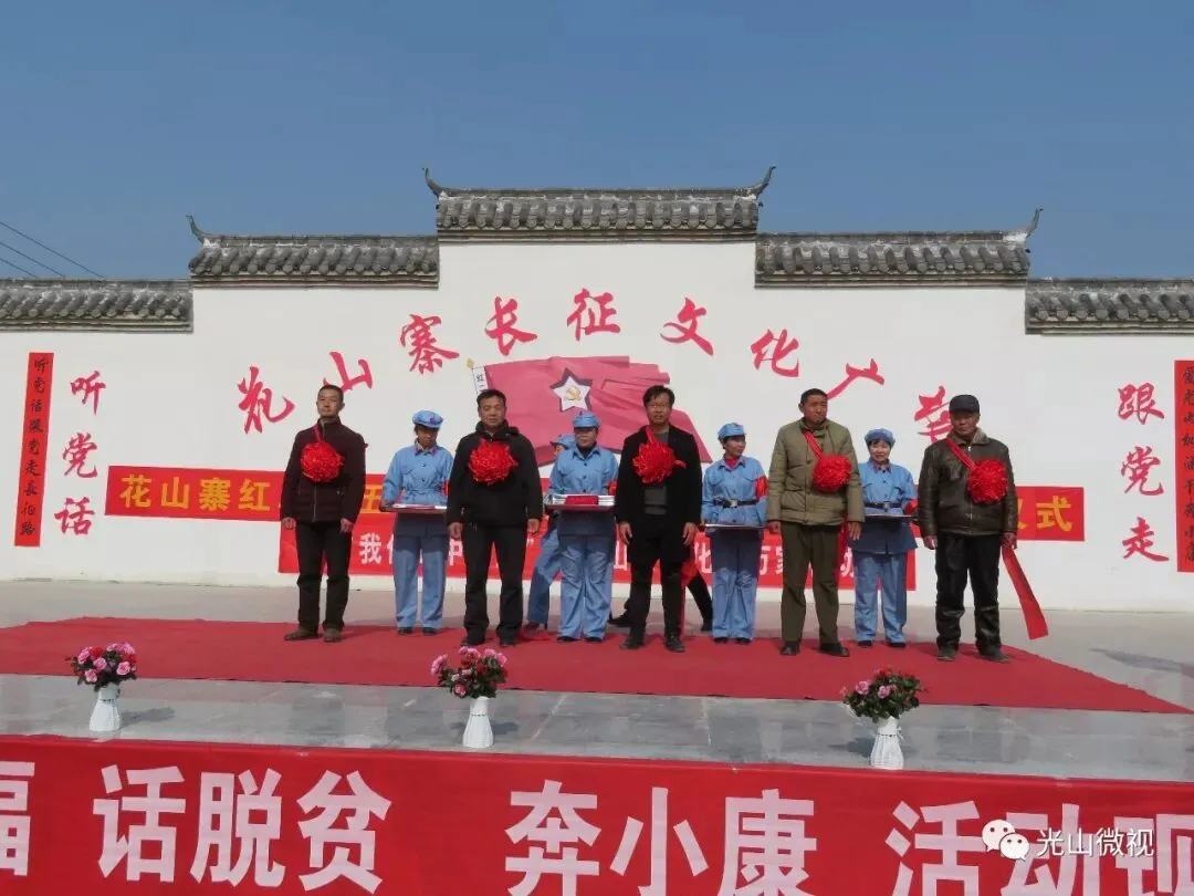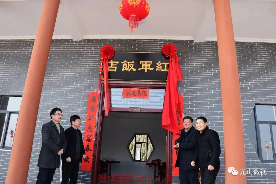 2016年10月中办政策研究室第一党小组支部接对帮扶花山村党支部,2018年2月,省委、市委组织部从党费中抽出100万元,支援花山寨革命老区空壳村壮大集体经济建设,经过项目论证与批准等程序后,2018年5月动工兴建。花山寨“红军饭店、旅游商店”及长征文化广场,总占地面积5.9亩,房屋26间,此两店除具备一般的餐饮、购物功能外,最主要的特点是办成传统爱国主义教育基地,让游客在就餐、玩赏、购土特产的同时,不由自主的接受红色教育,了解光山的长征文化。十九间主房分别设立“红军厅”、“长征厅”、“先锋厅”、“让贤厅”、“花山寨厅”、“会师厅”等,墙壁上分别挂满红军在花山寨发生的革命故事及红二十五军先锋精神,画面主题鲜明,内容各异,图文并茂,百看不厌。服务员着红军装,热情主动,服务周到,让游人感受到当年红军品德与情怀。