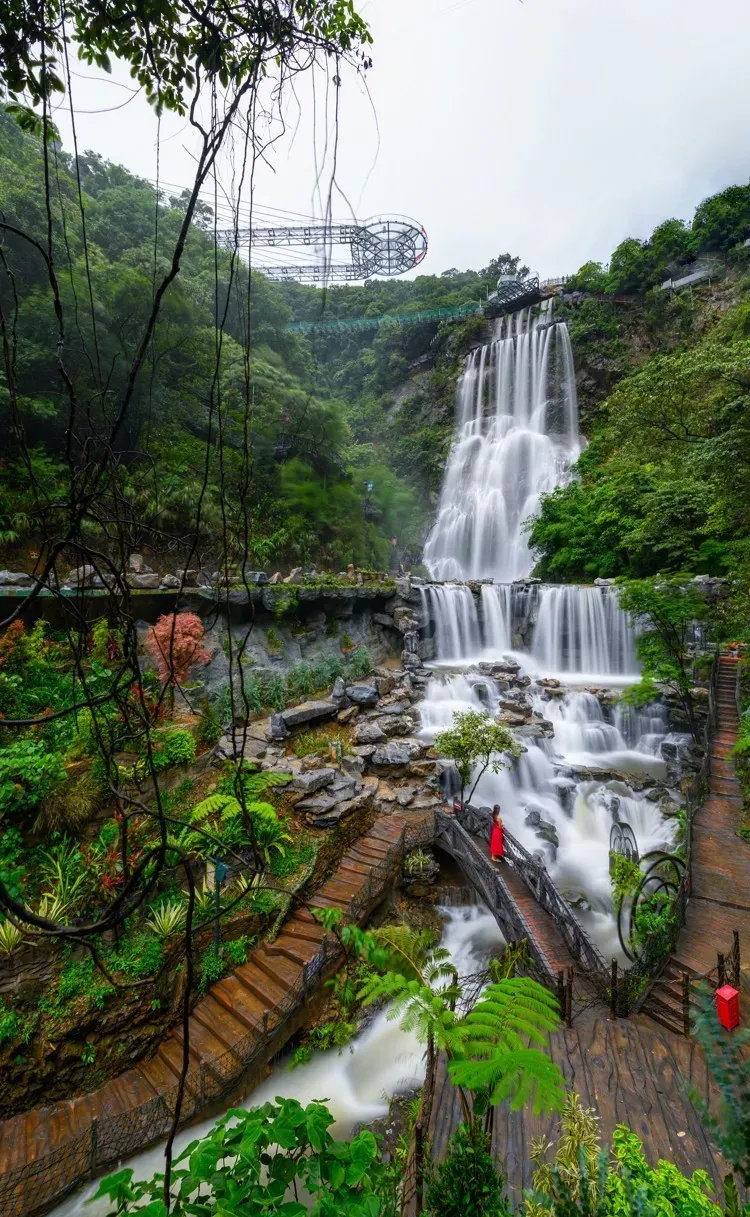 【古龙峡云天玻霸】(不含上桥,自费 108 元/人)集玻璃云台、云梯、云桥于一体,总长度 1314 米,寓意着一生一世,在玻璃上总步行时间约 45 分钟,玻璃峡谷位于万丈崖大瀑布的顶端,目之所及,悬崖峭壁、飞瀑擎天,古龙峡玻璃峡谷,采用 3
