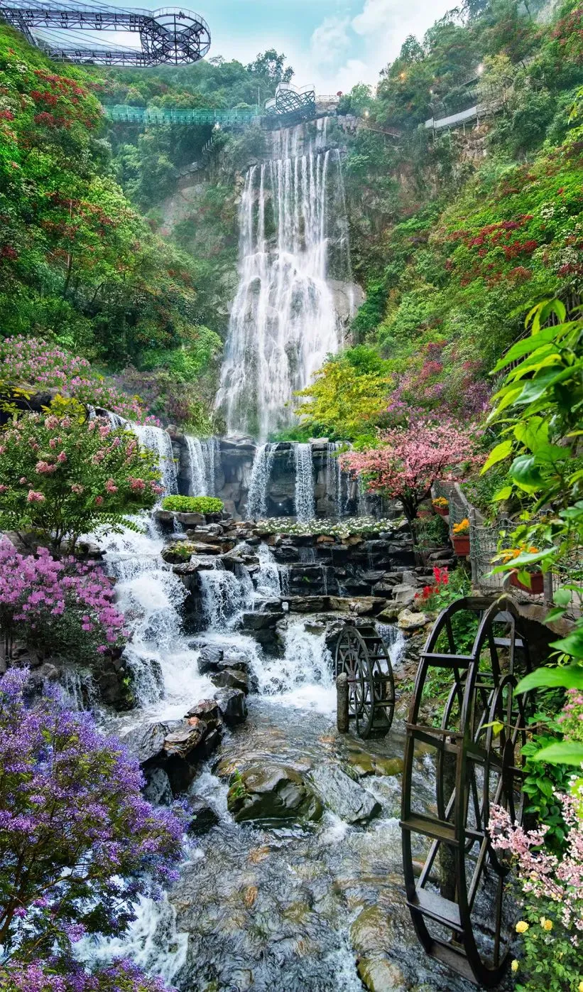 【古龙峡大瀑布】位于古龙峡河谷,长度 610 米,总落差 263 米,终年水流充沛,是国内落差最大的阶梯瀑布群;位于瀑布群入口的双龙瀑布,形似两条白龙,一曲一直,一隐一现,犹如双龙迎宾,沿着双龙瀑逆溪而上,林密谷幽,瀑流相伴,自下而上分布着天龙、藏龙、飞龙、见龙、猛龙、越龙、云龙等九级阶梯瀑布,游客就来到了碧绿深幽的潜龙潭,可以零距离体验主瀑布——云龙大瀑布扑面而来的震撼。