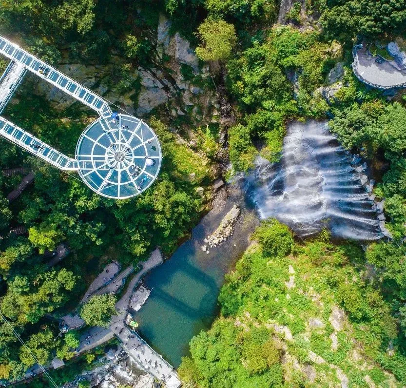 层共 4.5 厘米的超级透明玻璃,是目前世界上最厚的栈道玻璃,超白玻璃透光率 99 漫步其中,犹如闲庭散步,俯视下方,却又步步惊心!挑战【世界最长】【古龙峡悬空玻璃平台】全长 202 米,悬空跨度 72米,是美国科罗拉多大峡谷 U 形桥的 3.5 倍,顶部是一个直径 16.8 米的玻璃平台,就是主角:世界玻!从底部仰视犹如天外来客。