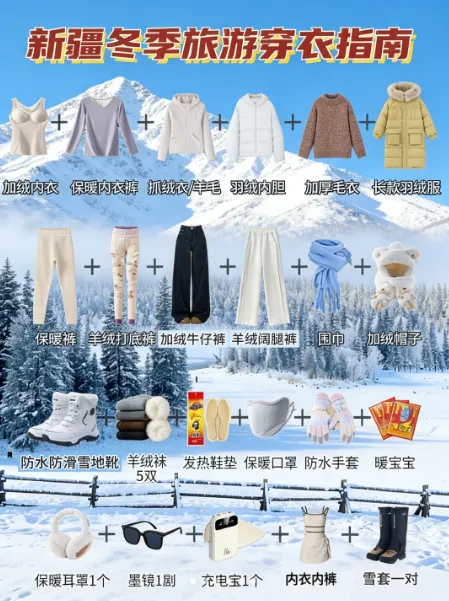 👖 裤子:保暖秋裤 + 加绒冲锋裤 或 羽绒裤👟 鞋子:中高帮防滑雪地靴(鞋底纹路深!普通雪地靴易打滑)+ 厚滑雪袜🧤 手套:1副厚滑雪手套(玩雪用)+ 1副薄触屏手套(拍照用)🧢 帽子:能护住耳朵的毛线帽或雷锋帽(室内外各一顶更方便)🧣 围巾/面罩:可选,但注意呼吸会结冰!建议用高领+口罩组合