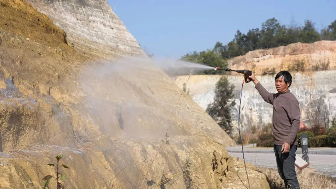 在景区核心区域,工作人员趁着连日晴好天气,紧锣密鼓对沙林山体采用特殊工艺开展大面积防护作业。“我们将面油与水按特定比例调和,通过高压喷雾方式均匀喷洒至山体表面,形成一层保护膜,既能防风防水,又能抑制杂草生长、避免山体形态与色彩遭破坏。”陆良县彩色沙林工艺美术师郭贵富介绍道。