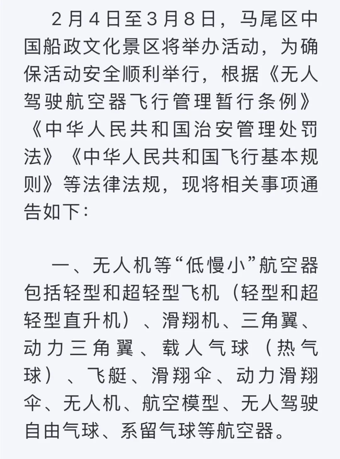 中国船政文化景区周边,2月4日至3月8日部分时段禁飞无人机!