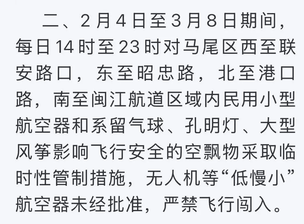 今天,记者从福州市公安局马尾分局治安管理大队获悉,为确保2026年2月4日至3月8日期间重要活动的顺利进行,在2月4日至3月8日每日14时至23时,中国船政文化景区周边将对民用小型航空器和空飘物采取临时性管制措施,请广大市民积极配合。