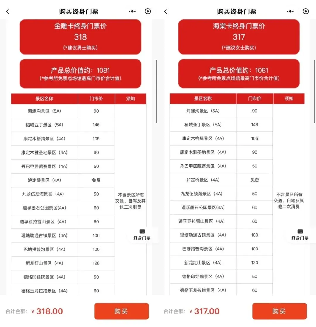 2026年1月28日,四川甘孜州在成都举办了一场以“圣洁甘孜·一生有约”为主题的活动发布,正式推出全国首创景区终身门票制。此次推出的终身门票卡限量发行100万张,包括两类:一是面向单一景区的“终身畅游卡”,按景区门票价格销售;二是涵盖全州14家收费景区的“终身畅游卡”,游客只需支付317元(贡嘎海棠卡)或318元(贡嘎金雕卡),本人即可终身无限次畅游海螺沟(5A)、稻城亚丁(5A)等14家4A级及以上景区,14家景区单次门票总价高达1091元,让游客真正实现“一次购票,终身免费”。其设计灵感来源于“丝路甘孜”G317和“中国人的景观大道”G318两条公路,卡名则取自甘孜州州花海棠与州鸟金雕。