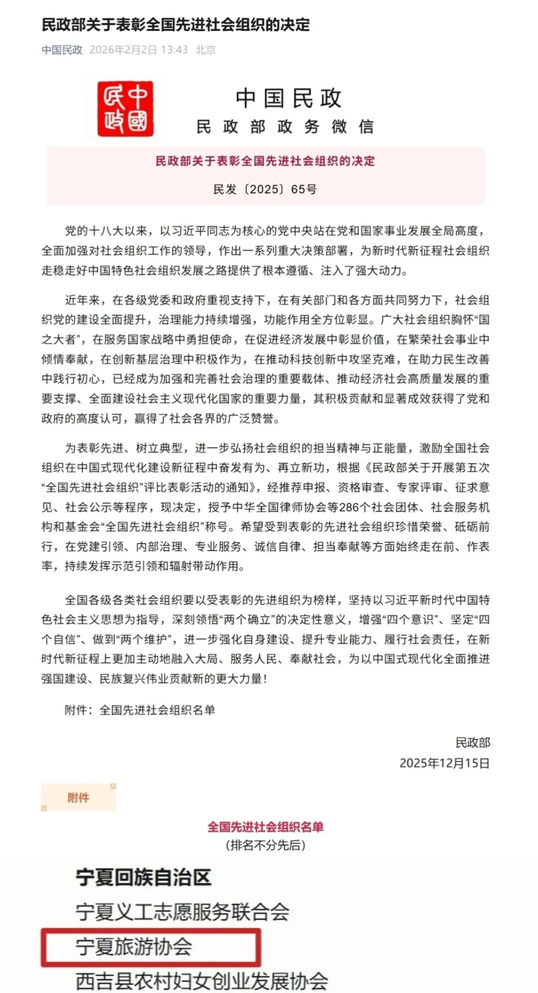 2026年2月2日,民政部发布《关于表彰全国先进社会组织的决定》,对全国286个社会团体、社会服务机构及基金会予以表彰,宁夏旅游协会成功获评“全国先进社会组织”称号,成为我区旅游领域首个获此国家级殊荣的行业协会。