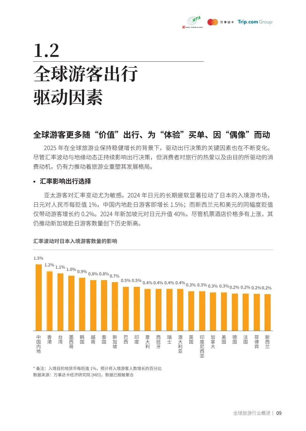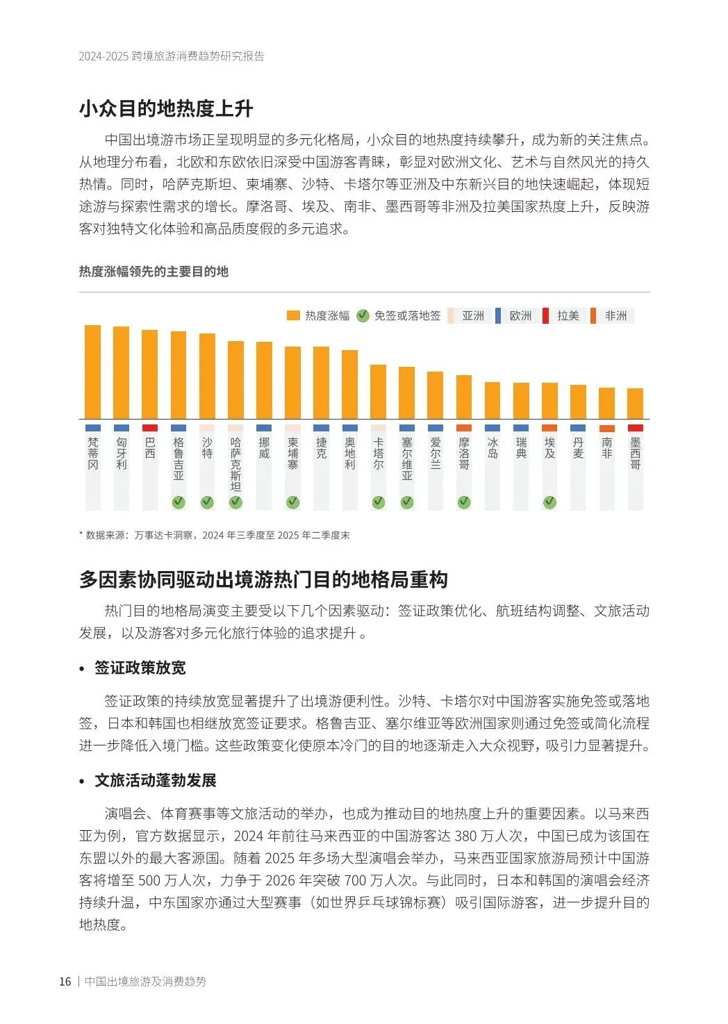 全球旅游业稳健增长,区域热度分化明显。2025 年上半年全球游客出行人次突破 6.9 亿,欧洲仍是最热门区域,吸引超 55% 全球游客;亚太地区增速最快,2024 年国际入境游客人次同比增长 33%,东北亚表现突出。旅游消费受汇率、体验需求、赛事活动驱动,日元贬值显著拉动日本入境游,自然探索、赛事观赛等体验型消费成主流。 中国出境游稳步增长,目的地与消费行为升级。出境游人次和消费金额持续攀升,短途目的地领跑市场,日本、韩国稳居前列,小众高端目的地热度上升。Z 世代、亲子家庭、银发族需求分化,Z 世代依赖数字化工具 “说走就走”,亲子家庭注重安全与教育,银发族偏好深度长线游。消费向交通、娱乐、餐饮等体验型项目倾斜,“演唱会 + 旅游” 模式快速兴起。 中国入境游高速增长,政策与场景双重驱动。免签政策优化推动入境游客量激增,2025 年上半年免签入境占比达 71.2%,停留时间延长。一线城市仍是核心目的地,三四线城市增长显著,文化体验类旅行成热门,购物、餐饮消费占比上升。支付便利化措施受青睐,地铁拍卡、外卡内绑等方式广泛应用。 出行新趋势凸显,情绪、在地文化与 AI 成核心引擎。“情绪” 成为旅行核心驱动力,疗愈旅行搜索量激增,游客追求心灵放松;“在地文化” 受追捧,小众目的地通过社交媒体快速出圈,深度体验当地生活成潮流;AI 技术重塑行业,旅游平台推出 AI 助手,在行程规划、预订服务等环节提供智能支持。 跨境旅游发展聚焦便利化与可持续性。出境游需优化签证、航线、支付等便利化措施,开发多元化产品;入境游应强化品宣、完善交通接驳、提升支付与退税体验。可持续旅游成重要方向,倡导尊重当地文化、保护生态,推动旅游从数量扩张向质量与责任并重转型,实现均衡、包容发展。