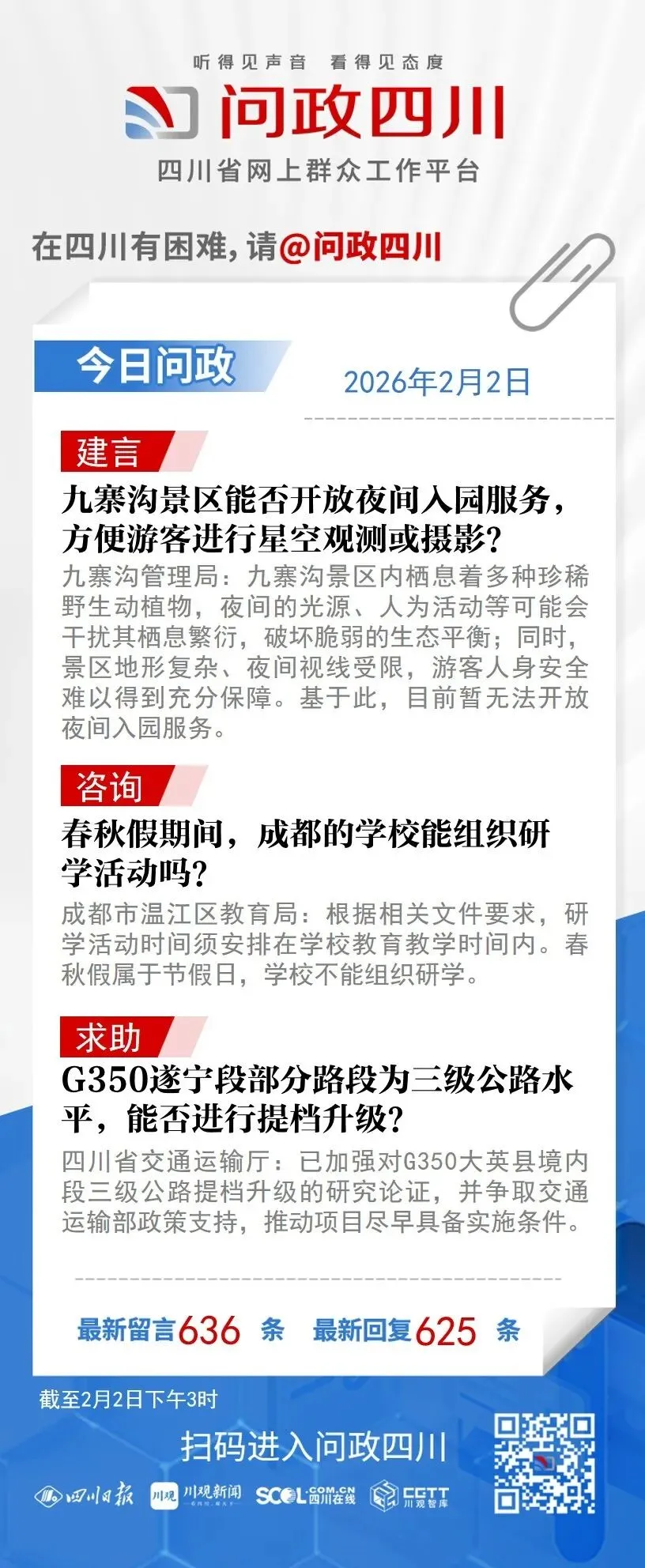 九寨沟景区能否开放夜间入园服务,方便游客观测星空?回应来了→…… 一起来看看 相关部门的回复吧 1.九寨沟景区能否开放夜间入园服务,方便游客进行星空观测或摄影? 问政四川网友提问:九寨沟景区目前17:00清场、18:00闭园,但九寨沟地处高海拔、低光污染区域,具备星空观测和摄影条件的时间通常在20:00以后,现行闭园制度使游客无法体验和拍摄夜空资源。建议九寨沟景区开放夜间入园服务,实行单独预约与专项购票制度,方便游客进行星空观测或摄影? 九寨沟管理局回复:非常感谢您对九寨沟景区的关注与厚爱,更感谢您提出“夜间星空观测试点开放”这一富有创意的宝贵建议! 九寨沟作为国家级自然保护区和世界自然遗产地,始终坚守 “生态优先、安全至上、可持续发展”的核心管理原则。景区内栖息着多种珍稀野生动植物,夜间的光源、人为活动等可能会干扰其栖息繁衍,破坏脆弱的生态平衡;同时,景区地形复杂、夜间视线受限,游客人身安全难以得到充分保障。基于以上考量,目前暂无法开放夜间入园服务,还望您能理解。 后续若景区相关政策有调整优化,我们将第一时间通过官方网站、微信公众号等渠道及时告知。 2.春秋假期间,成都的学校可以组织研学活动吗? 问政四川网友提问:请问春秋假期间,学校是否可以组织研学活动? 成都市温江区教育局回复:经责成区青少年活动中心核实,根据《成都市教育局关于印发<成都市中小学生研学旅行工作指南(试行)>的通知》(成教函〔2024〕41号)文件要求,研学活动“时间须安排在学校教育教学时间内,学校可根据教育教学计划灵活安排研学旅行时间,尽量错开旅游高峰期。凡是利用周末、节假日开展的外出活动以及冬夏令营、出国游学等活动均不属于研学旅行活动。”春秋假属于节假日,学校不能组织研学。 3.G350遂宁段部分路段为三级公路水平,能否进行提档升级? 问政四川网友提问:国道G350从广安到都江堰,是盆地内由西向东的交通干线之一。近些年,广安段、德阳段、成都段多为一级公路标准,但G350遂宁段部分路段仍为三级公路水平,请问有无提档升级规划? 四川省交通运输厅回复:经核实,G350遂宁段起于广安武胜界唐家湾,经蓬溪县、船山区、大英县,止于大英县玉峰镇付泥桥,全长约114公里。目前,该路段除大英县玉峰镇和桂花镇境内约3公里现状为三级标准外,其余111公里均已达到二级及以上技术等级,能较好服务沿线交通出行和经济社会发展。为进一步提升路段通行能力,我们已加强对G350大英县境内段三级公路提档升级的研究论证,并积极争取交通运输部政策支持,推动项目尽早具备实施条件。 下一步,我们将继续加强汇报,争取更多路段提档升级项目纳入国家“十五五”规划,进一步提升G350遂宁段技术等级和服务水平,更好服务群众便捷出行和经济社会高质量发展。 4.提高出行效率,龙泉驿区公交车能否设置为“铃停巴士”? 问政四川网友提问:成都不少区县都有“铃停巴士”,但龙泉驿区公交尤其是乡村路段,即便没人上下车也要站站停,频繁开关门十分不便,极大影响出行效率,像852路大部分是乡村站、L006等为翻山路线,没必要每一站都停靠,希望龙泉公交尽快设置“铃停巴士”提高效率。 龙泉驿区城运中心回复:经成都经开交通服务有限公司调查,龙泉驿区公交服务覆盖范围广,且老年乘车群体占比相对较高,为兼顾不同年龄段、不同文化程度的乘客出行需求,保障乘车安全与出行便捷性,目前龙泉城区公交均执行“逢站必停”的站点停靠标准,暂未制定调整为“铃停巴士”的相关计划。 感谢您提出的宝贵建议,我公司将持续关注市民出行需求变化,结合区域发展实际、客流特征等情况,不断调研优化公交运营服务模式,为广大市民提供更优质、高效、便捷的公交出行服务。