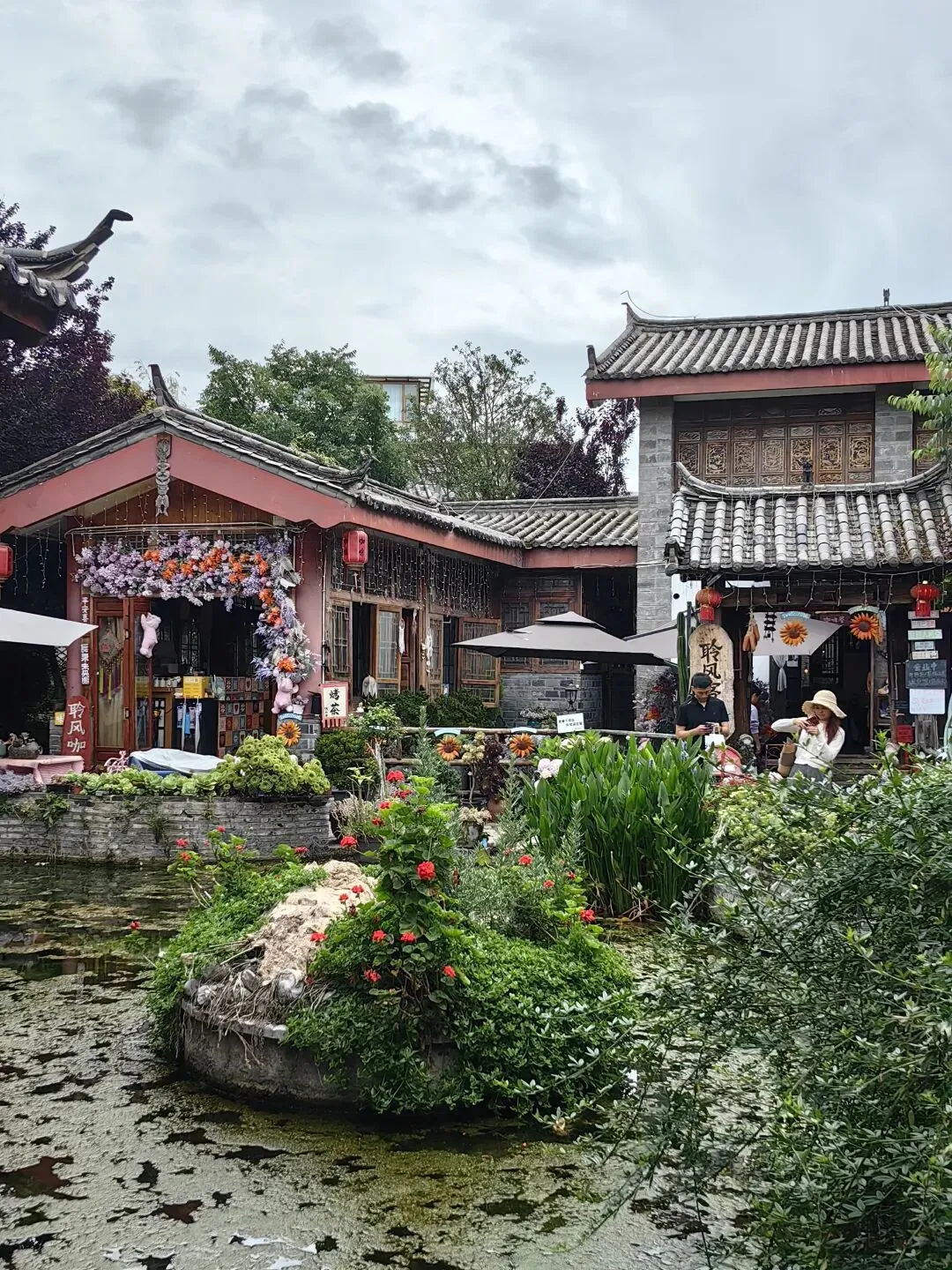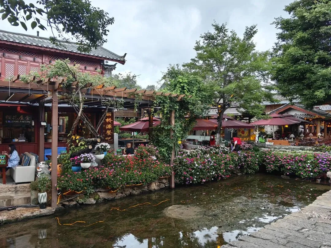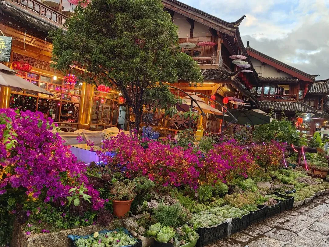 纳西人居住的束河古镇与大理古镇又有不同,这里就多了很多喝茶和喝咖啡的店面,布置的非常漂亮和舒适,主要的装饰就是鲜花,种植的各种绿植和花卉,生长的非常旺盛,点缀的各种串灯和风铃,还有驻唱歌手。坐下来听听歌,喝喝茶,真是人间美好。