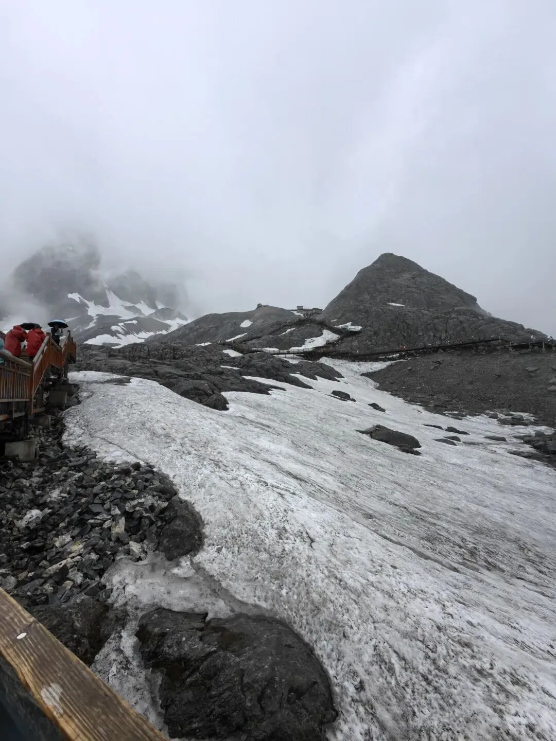 午饭后去玉龙雪山。被导游鼓动去买了39元一瓶的氧气,说送的太少不够用。出于担心自己高反,几乎人人都买了一瓶。坐索道时就开始断续吸氧,刚到雪山上又开始下雨,幸亏旅行社租了棉衣,穿着棉衣手都快冻僵了。索道到达4506米的冰川公园,我们没有继续往上走的勇气,这时风雪交加,雾气漫天,几乎看不到雪山。偶尔雾气被风吹走,能看到雪山的景色。我们赶快拍上几张照片,准备排队乘索道下山。雪山的人很多,雪山上最多玩了半小时,坐索道上下排队就花了一个多小时的时间。