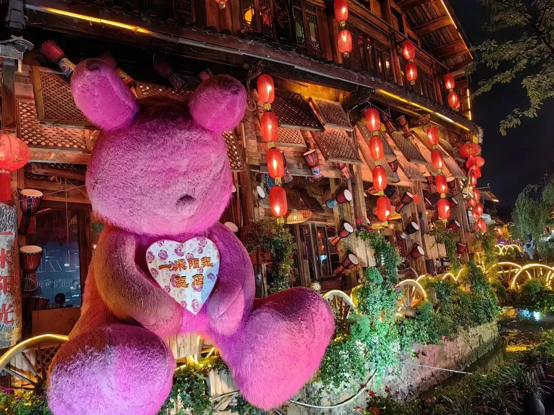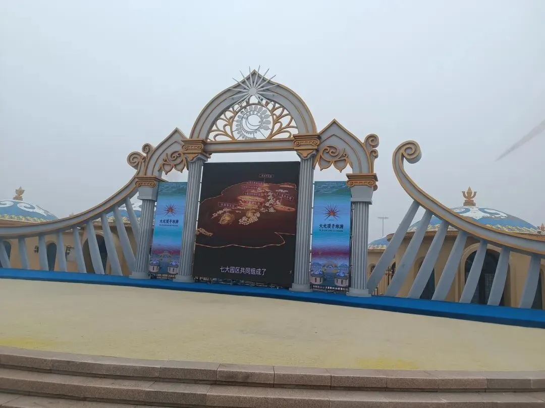 雨雾中的北疆风景大道,标识牌在朦胧中静立,“THE BEST VIEW OF NORTH”的字样仿佛一句温柔的启示。雾气轻笼着异域风情的拱门与远处蓝白屋顶,星月装饰若隐若现。一切景物退为淡雅的背景,此刻的“光谷”不似晴日绚烂,却更接近秘境本身——含蓄、宁静,在潮湿的空气里舒展成一首无需晴空注解的散文诗。