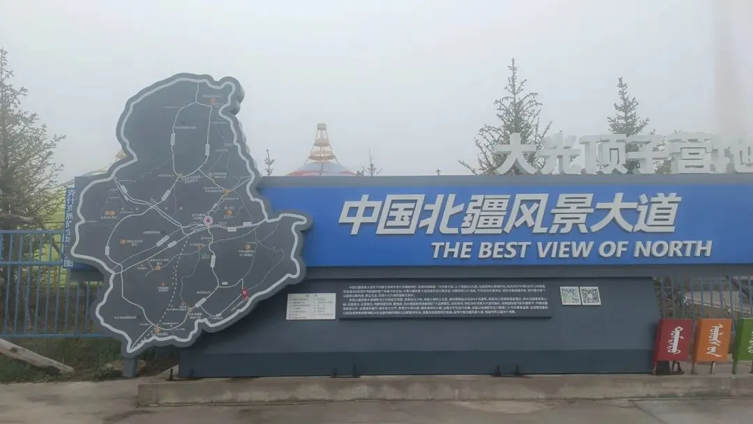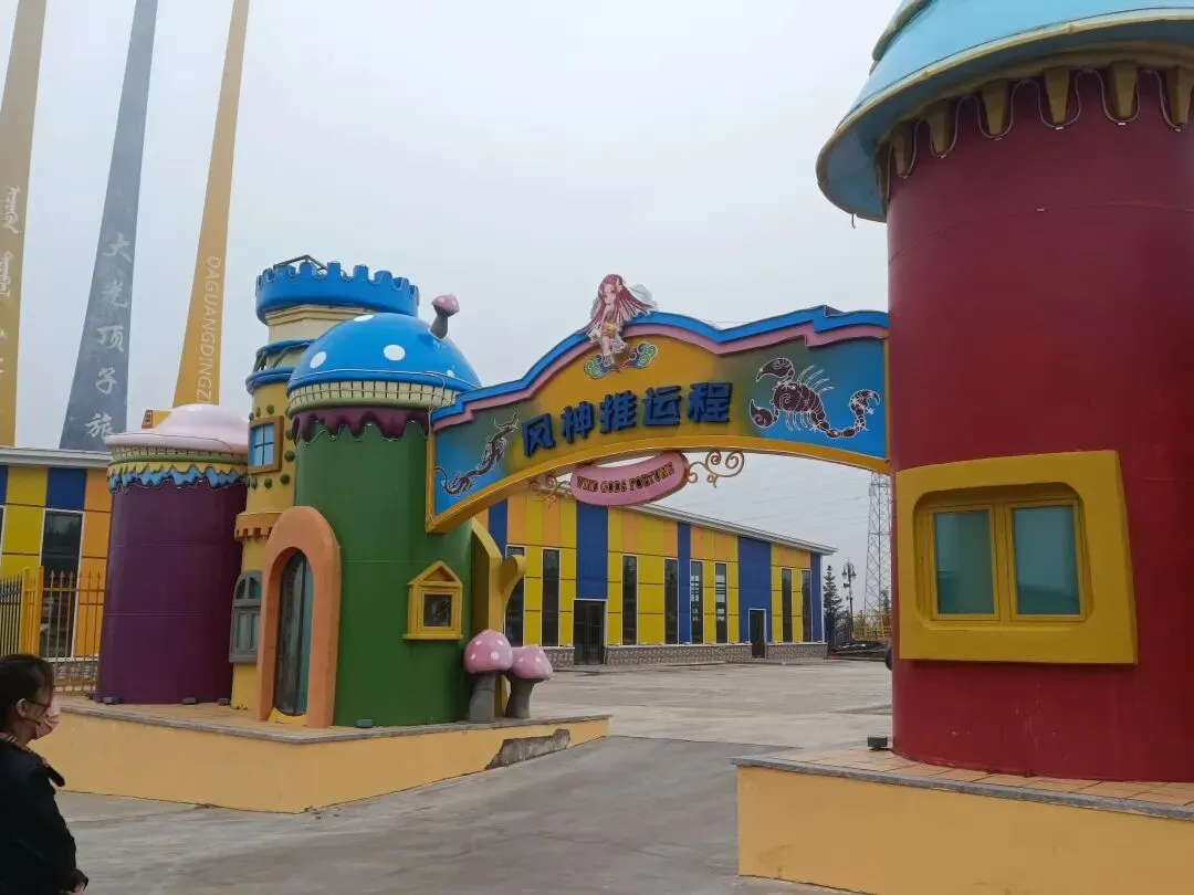 雨雾中,“风神游乐园”的彩墙与横幅宛如一幅洇湿的画卷。“风龍雲起”的字样在氤氲水汽中仿佛获得了生命,远山与风车隐入苍茫。游人的身影点缀其间,让这幅静谧的画面有了呼吸。此刻,风的故事不再喧嚣,而是在每一缕雾气中低徊,等待被轻轻聆听。