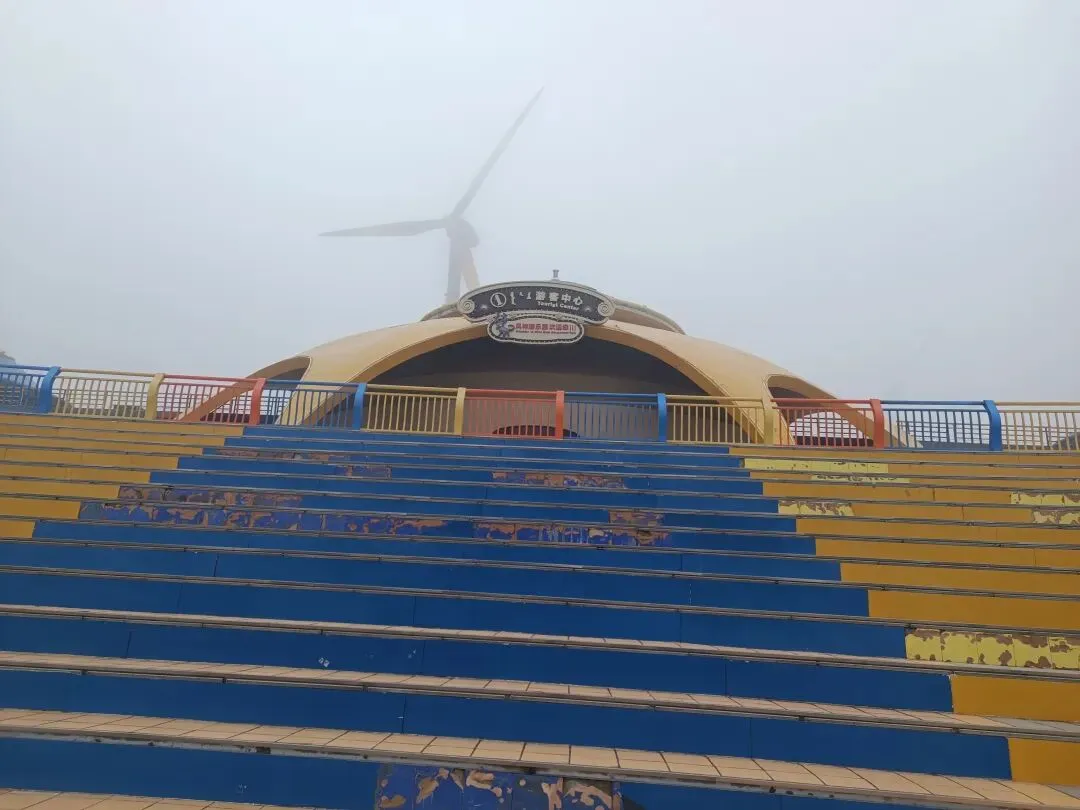 雨雾浸染下,“风神推运程”的童话拱门色彩愈发浓郁,宛如通往秘境的神秘入口。拾级而上,蓝黄阶梯的斑驳痕迹与雾气中静默旋转的风车,共同低语着时光的故事。此刻,风神的祝福似乎就藏在这片湿润的空气里,等待放晴时,借风车叶片写满天空。