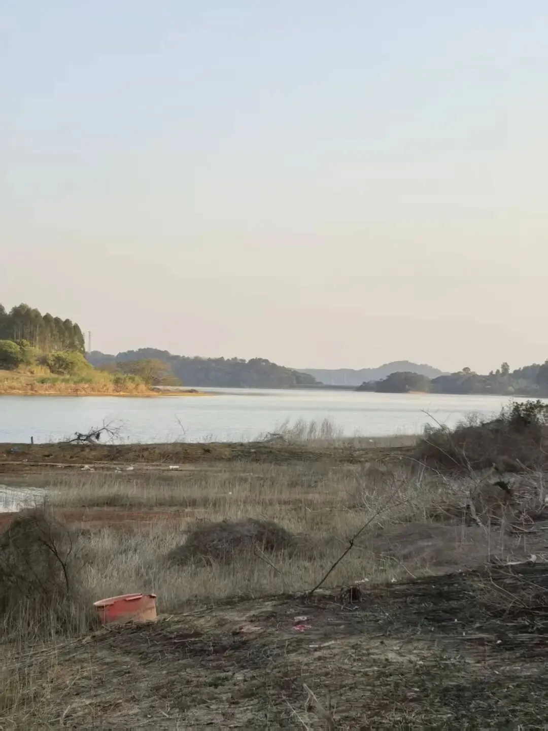 第一条岔路没有走到湖边,因为前面有一片沼泽地,这段时间不下雨,湖面下降了不少,连水带泥,我怕陷入其中,不敢向前。远处有鸟在飞,也有许多一样的颜色的鸟在地面排成一队,看样子挺肥,应该是太胖飞不大动了。它们有点像是海鸥,但个头挺大。退出来以后,又去了另外一条岔路,还没走到尽头,看到有人骑着电动车,狗在前面跑着,迎着我过来,路面曾经是修过的柏油路,已经破损几乎只有路基的石子。再往前走,遇到了一位装着整齐的老人,却在农田里种菜的。我走过去,看到种了不少菜,有个小鱼塘,用一套电池水泵在给鱼塘里的鱼加氧。看到湖面伸向远处,虽然不很开阔,却也看不到尽头的景象。回程时,我和那种菜的打招呼:“你这是自耕农啊?”他笑着说:“那怎么办呢?打发一点时间吧。”我知道他的意思是退休了,没事可做,刚好有闲置的滩涂,可以做做农民。正说着,我夫人来电话了:“快5:30了,你回来吧。”我说:“我正在往回走。”