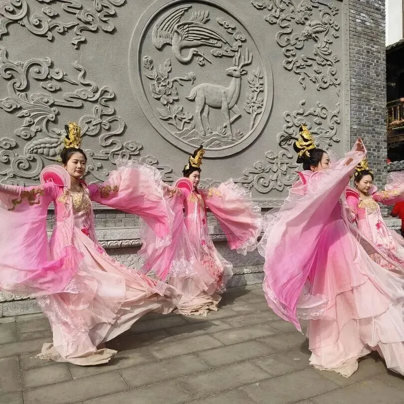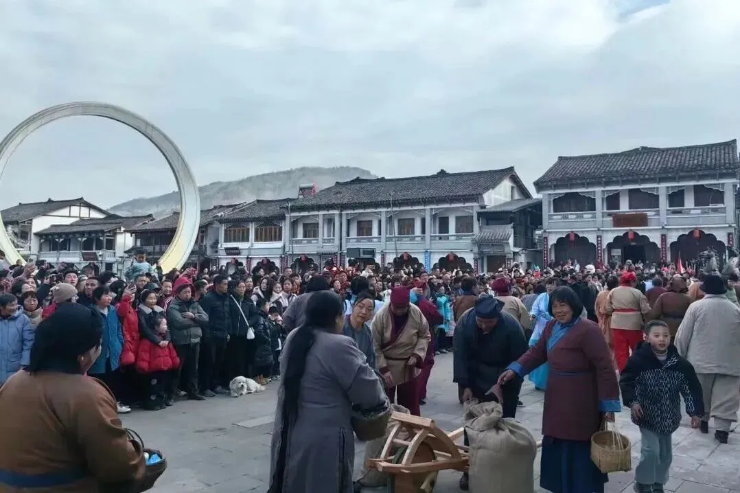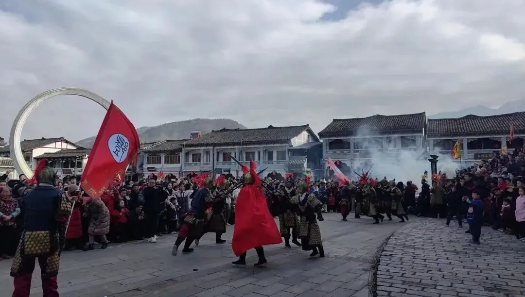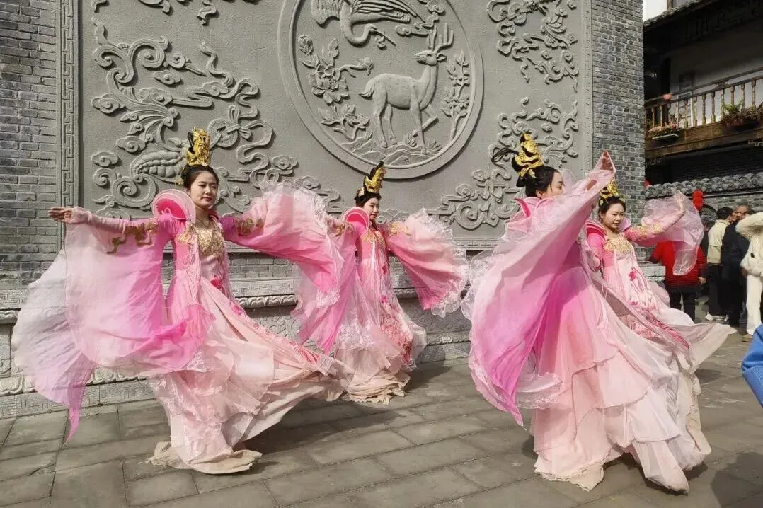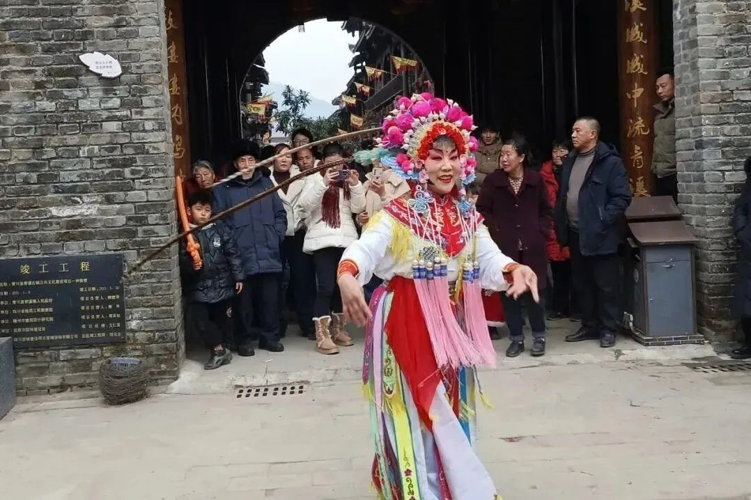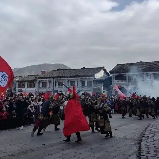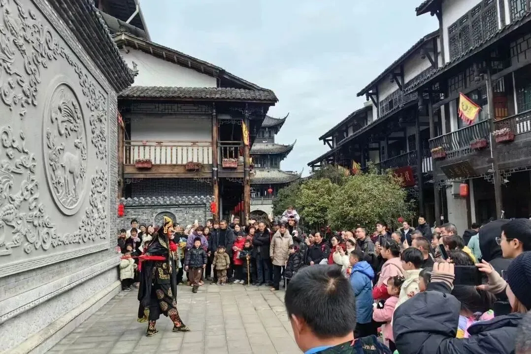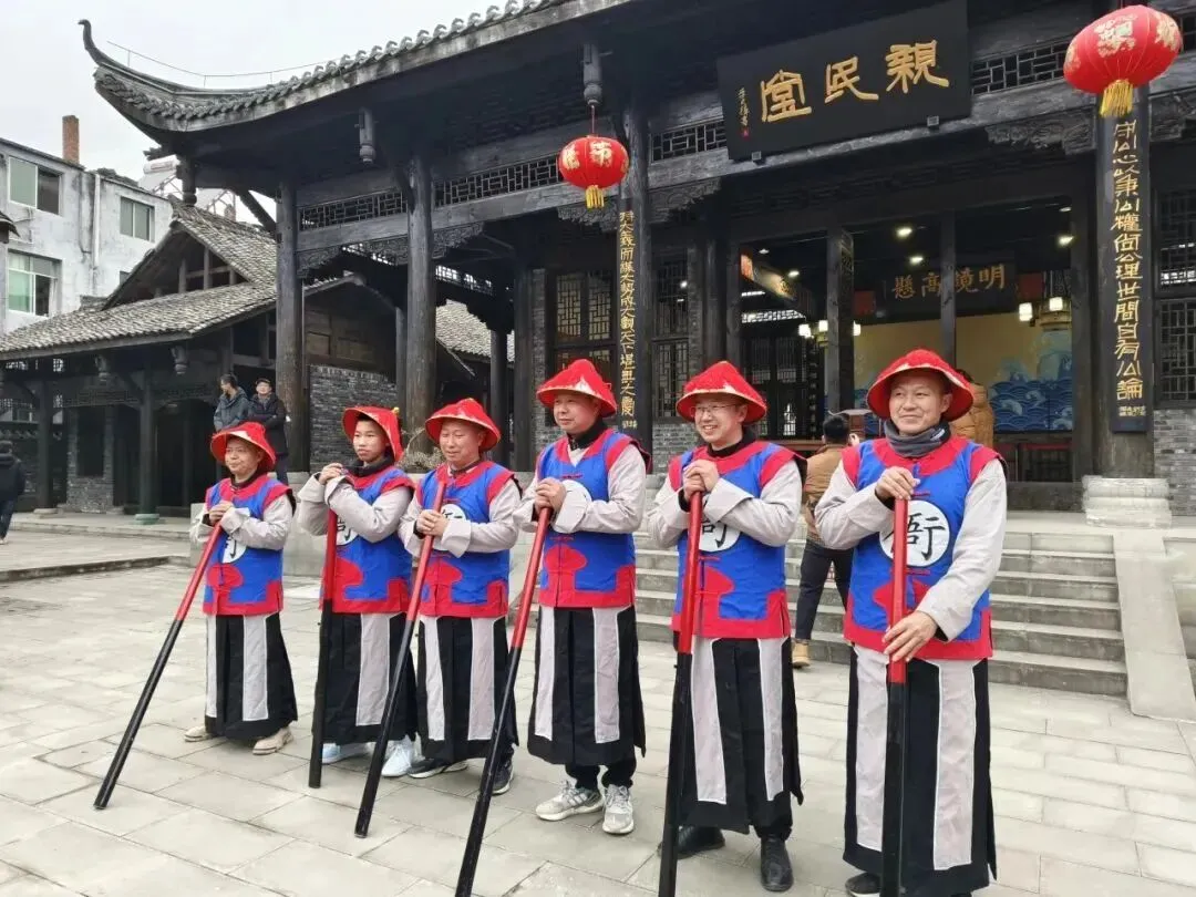 古城水街沿途,古装仙子载歌载舞,川剧变脸等绝技惊艳亮相,沿古城墙至县衙一路欢歌,热闹过大年。
