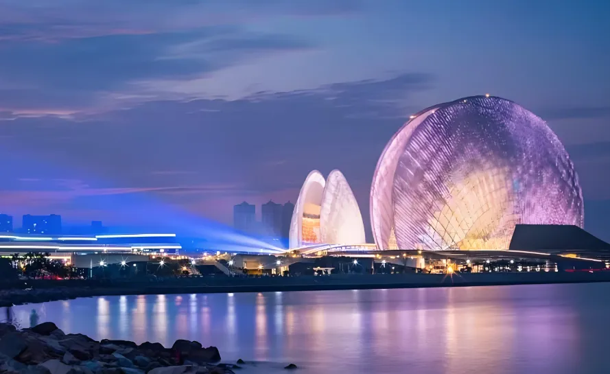 第八站:珠海大剧院野狸岛的“日月贝”,中国唯一建在海岛上的剧院。名亭公园拍日月贝和渔女同框,傍晚灯光亮起,像两片贝壳浮在海面。开放时间9:00-21:00,里面偶尔有演出,提前在公众号查。穿浅色系衣服,避免深色被夜景吞掉。
