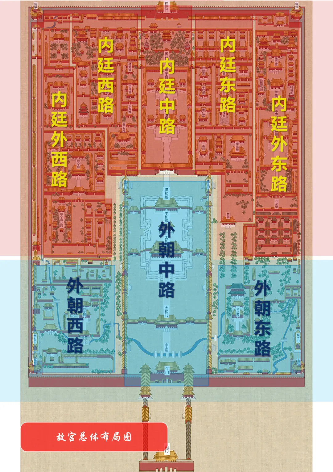 外朝区域可分为中、东、西共三路建筑群院落,内廷区域可分为中、东、西、外东、外西共五路建筑群院落。中路分界线在乾清门位置,东侧分界线在南三所南侧位置,西侧分界线在慈宁宫花园与造办处南侧位置,东西分界线基本对应太和殿两侧。