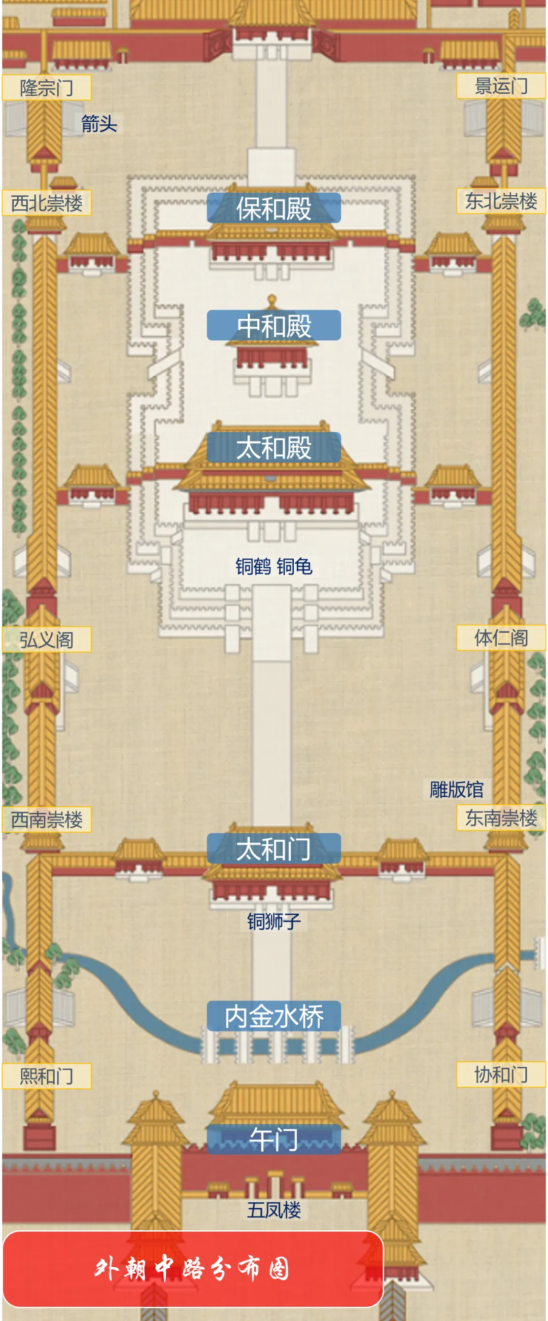 午门(五凤楼)→南大库(家具馆)→武英殿(陶瓷馆)→断虹桥(摸头捂肚小狮子)→文华殿(中泰交流展)→内金水桥→太和门(立耳且最大且唯一未鎏金铜狮子)→太和殿广场→广场东南角(雕版馆)→外朝三大殿(保和殿、中和殿、太和殿)