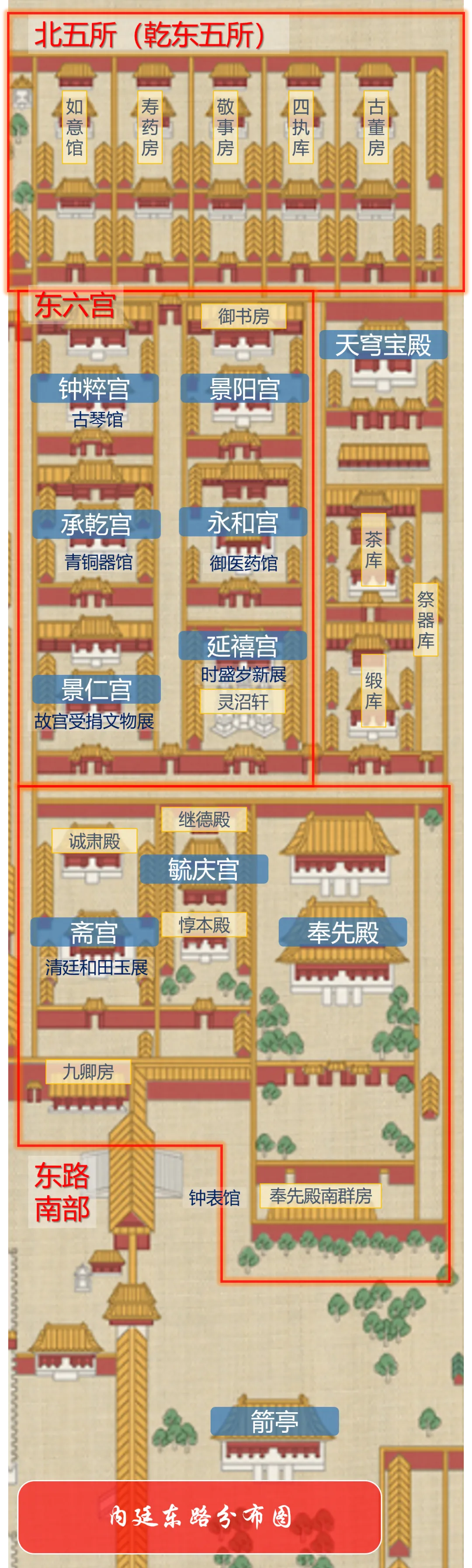 东路北部为北五所,即乾东五所,由西向东分别为如意馆、寿药房、敬事房、四执库、古董房。