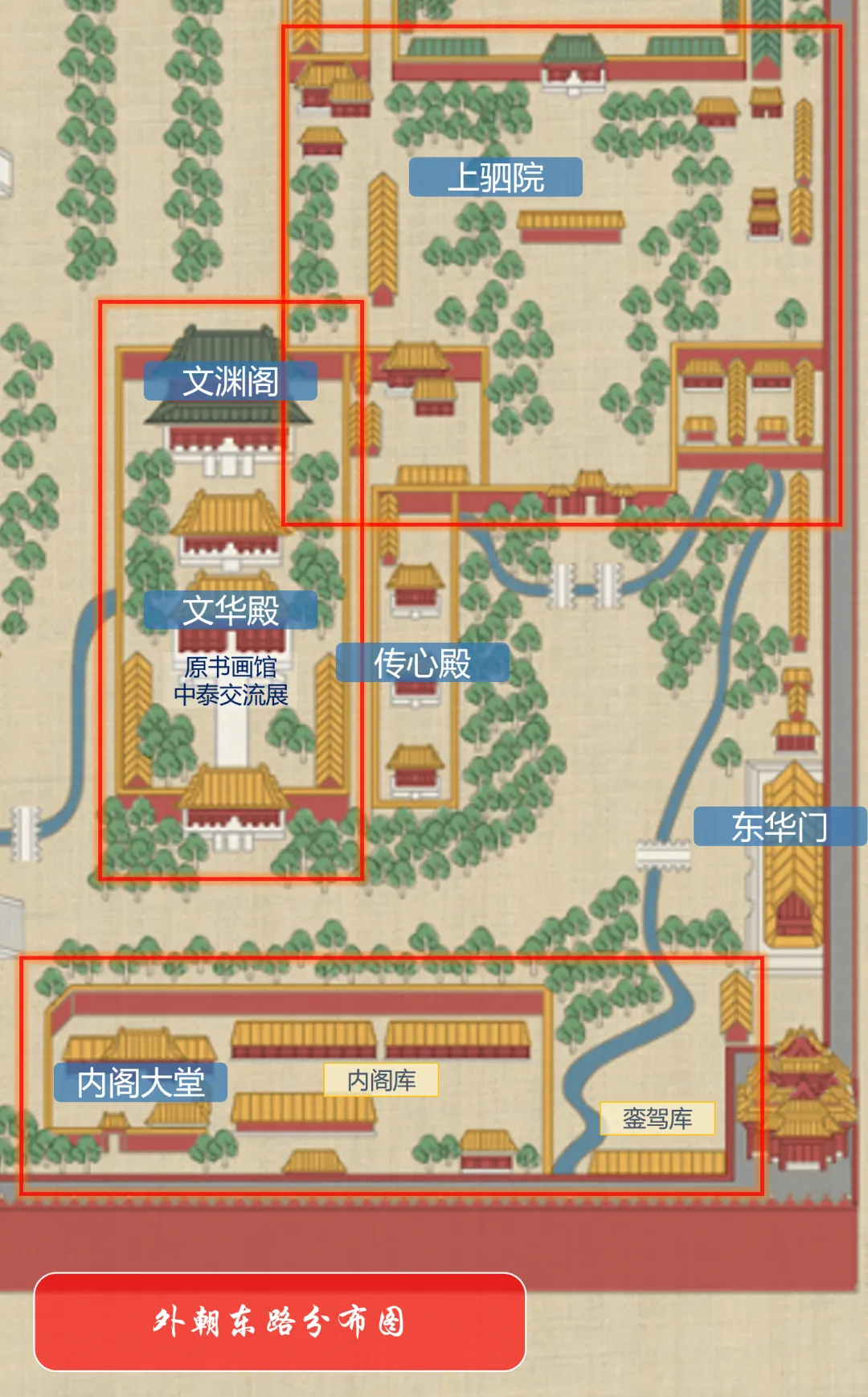 承光门(铜跪象)→御花园(东侧三亭藻井)→坤宁门→内廷后三宫(坤宁宫、交泰殿、乾清宫)→乾清宫广场(江山社稷二殿)→乾清门(垂耳鎏金铜狮子)→外朝三大殿(保和殿、中和殿、太和殿)→太和殿广场→广场东南角(雕版馆)→太和门(立耳且最大且唯一未鎏金铜狮子)→内金水桥→文华殿(中泰交流展)→东华门
