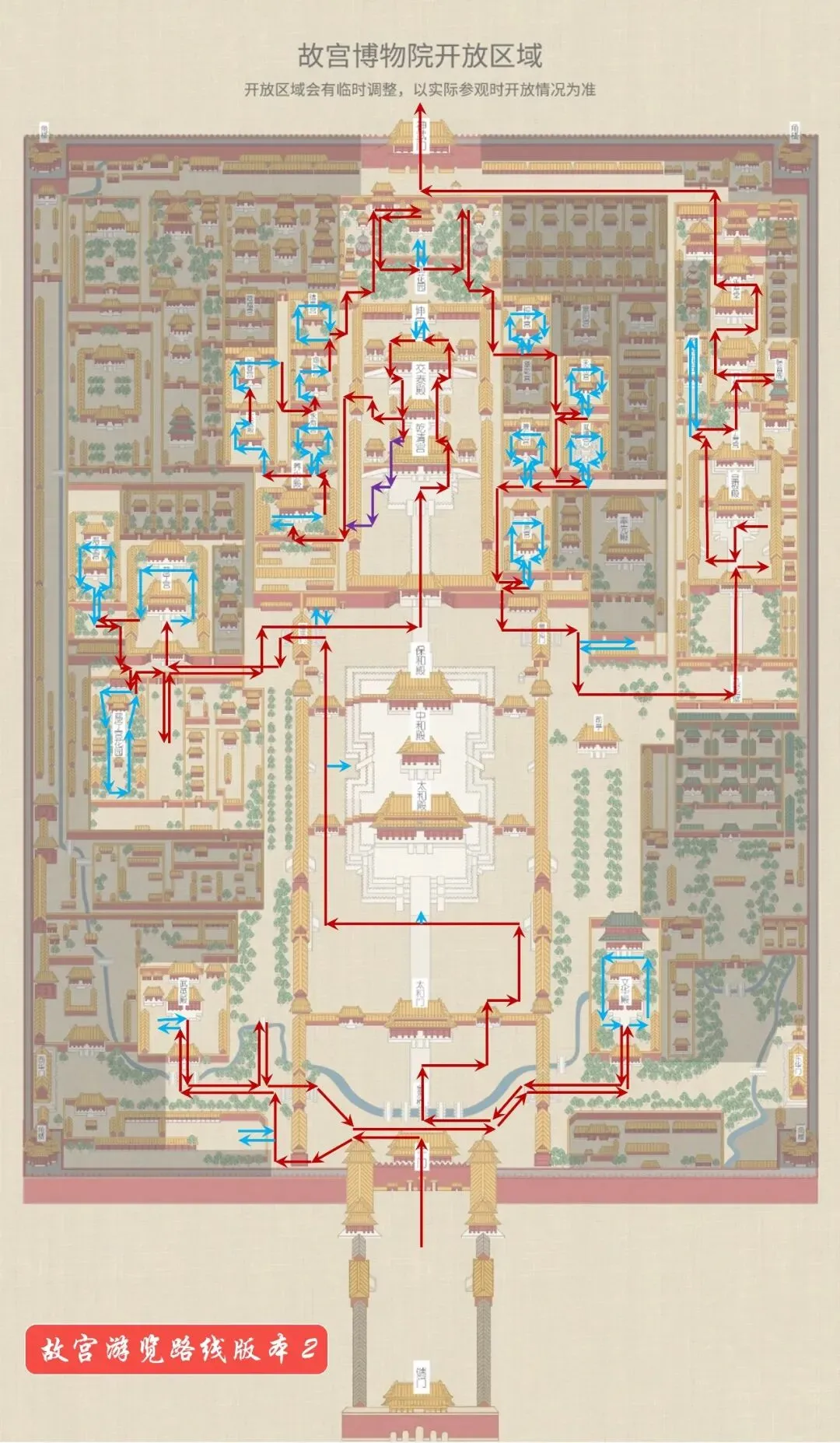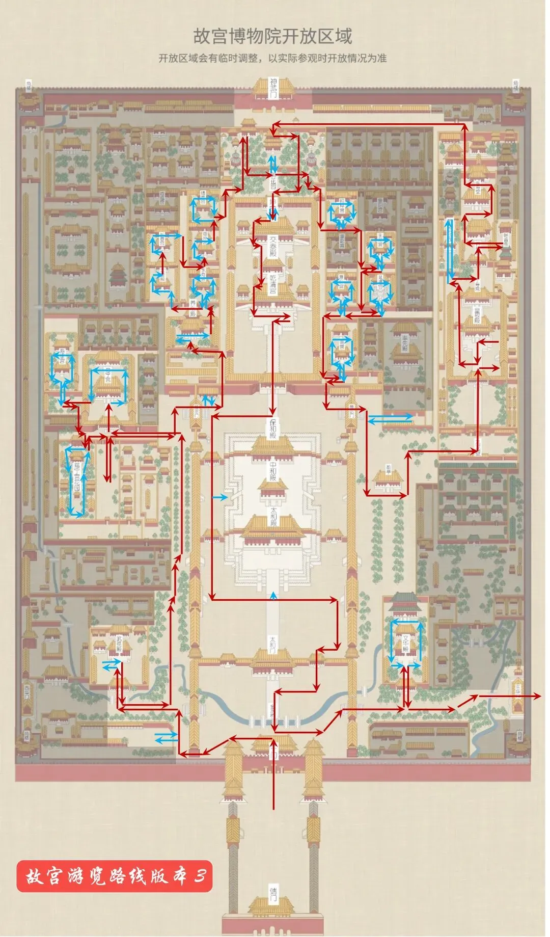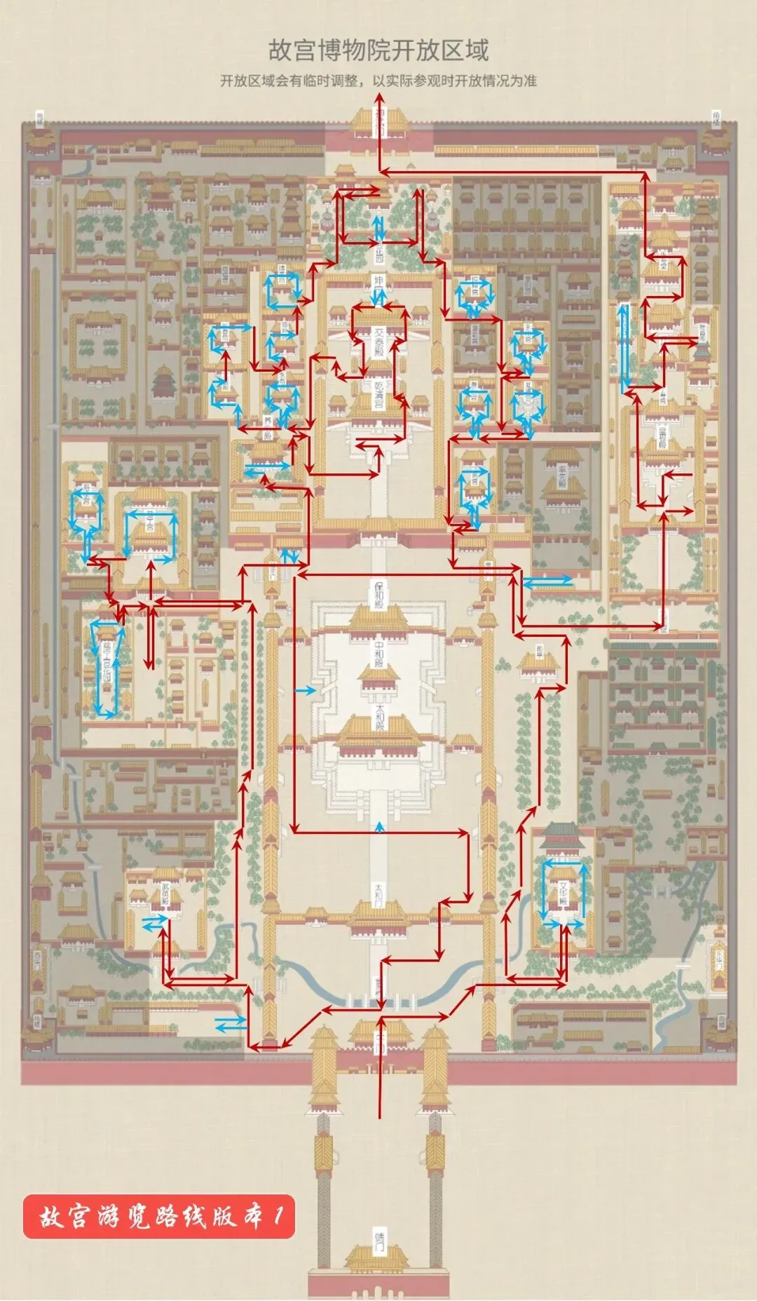 前面是故宫总体布局情况,如很多其他景点一样,内部有的区域开放,有的区域封闭,且不同时间开发区域会有变化。当前官网给出的开放区域示意图如下。