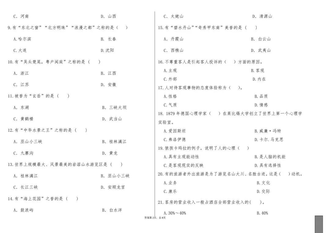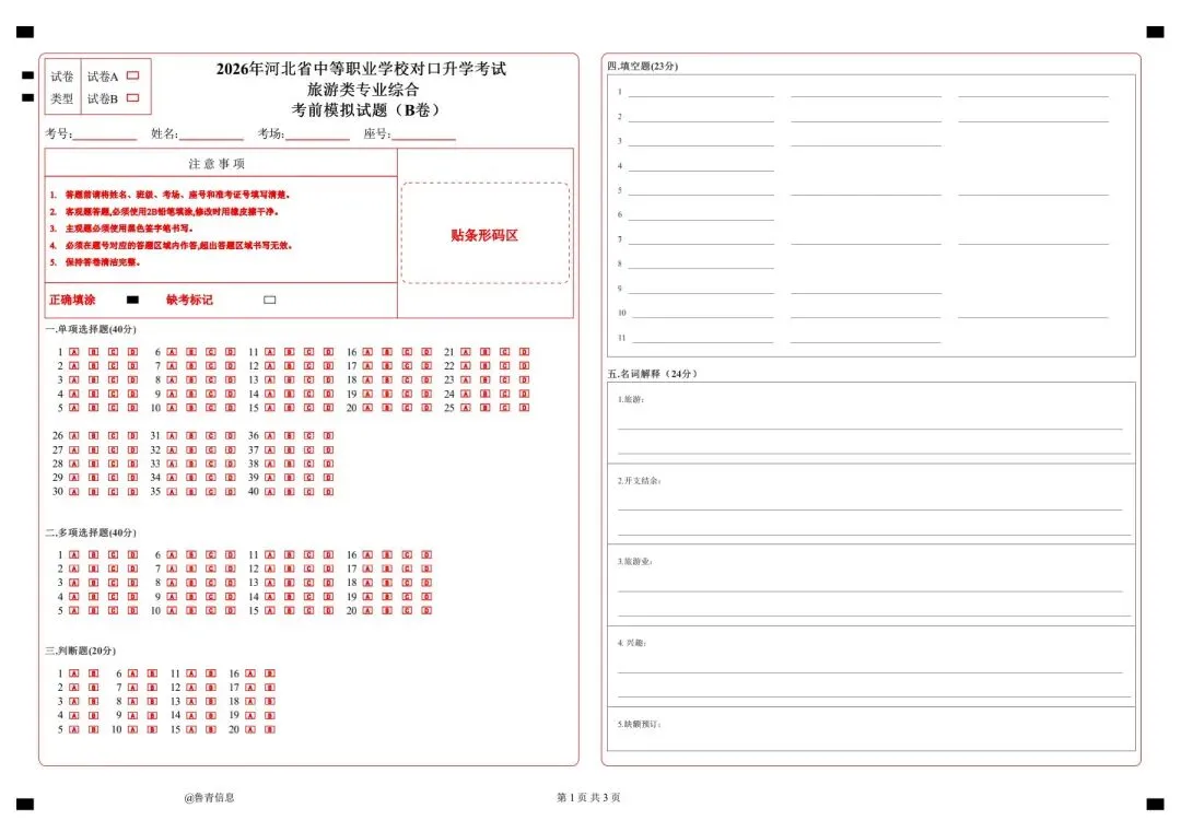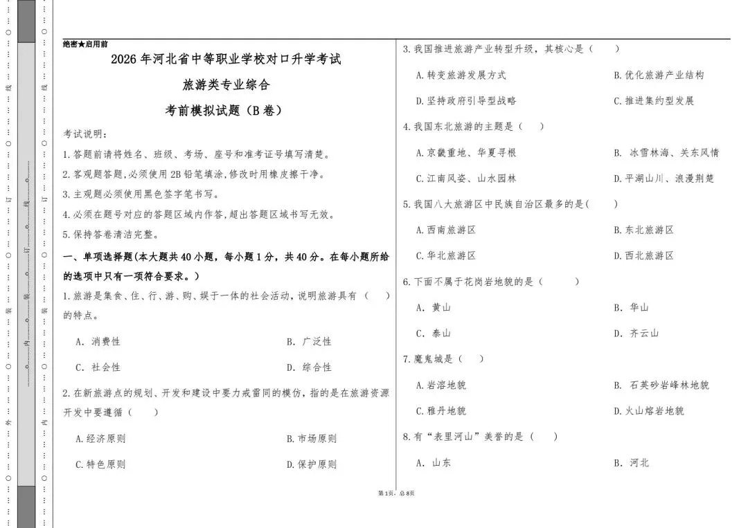 您现在的位置是:首页 > 国内旅游目的推荐 > 正文 国内旅游目的推荐 【旅游】2026年河北省中等职业学校对口升学考试旅游类综合(模拟考试B卷) admin2026年02月03日 02:35:32国内旅游目的推荐10 【旅游】2026年河北省中等职业学校对口升学考试旅游类综合(模拟考试B卷) 转载请说明来源于"旅荐网",部分内容转载自网络,如有侵权请联系qlwl@foxmail.com删除 本文地址:https://www.15386.cn/post/92295.html 上一篇 第10届云台会云台文化旅游产业交流合作对接会在普洱召开 下一篇 春节旅游去哪儿?|漫长的海岸线、古老的文化遗迹、多元的风土人情,越南的春节,是一场融合了浓厚汉文化底蕴与法式殖民风情的独特体验! 相关文章 重庆旅游攻略|3天2晚玩转8D魔幻山城,吃爽出片不踩雷,新手直接抄作业! 2026年山东招生组行程安排 提前规划行程!清明期间长途汽车票开启预售→ 收藏这份出游指南,一键开启快乐模式! 河南洛阳旅游保姆级攻略,值得收藏! AI 生活实用篇:旅行攻略、健身计划、家常菜谱,细节化指令让答案更贴心 女大三亚淡季两天一晚旅游攻略!人均2k��️ N30°度假海岸|象山渔文化研学旅游指南来了~ 伊犁五月初春马背旅行|小众旅行攻略 酒钢集团2026届春季校园招聘行程安排(第二篇) 发表评论 取消回复 评论列表 这篇文章还没有收到评论,赶紧来抢沙发吧~