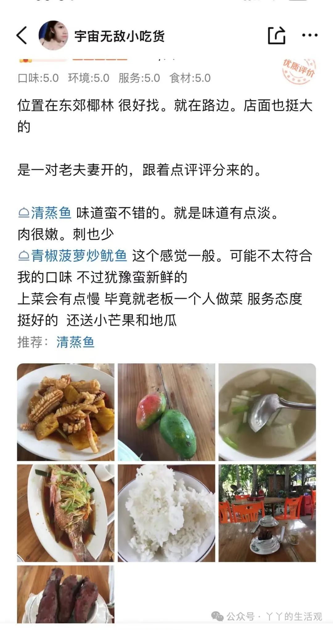 4、餐厅选择如果是三亚海口这样的大一点的市区,可以参考点评,如果是小的地方比如东方、乐东,直接看饭店餐厅里本地人的数量,本地人多的话,一般不会踩坑!