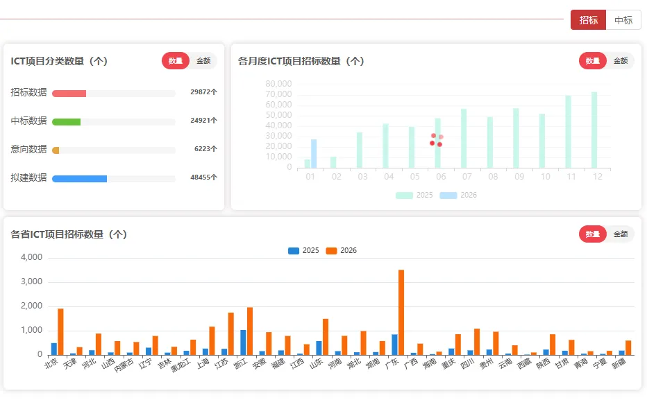 声明:本文所有内容及数据均来源于公开信息渠道,为人工整理分析创作,仅供行业交流参考,不构成任何投资及决策依据。 关于我们 ICT标局聚焦全国ICT领域标讯商机,为运营商、集成商、数字化产品厂商提供一站式商机服务。 实时更新ICT领域标前预告、商机预测、招/中标信息,汇聚数字产业、智慧化、信息化、大数据、系统平台类项目,提供标讯订阅、大数据分析,企业监控、企业画像、数据服务、行业报告定制、行业解决方案等,助您挖掘更多优质合作机会。 ICT标局-西北 ICT标局-华北 ICT标局-东北 ICT标局-西南 ICT标局 ICT标局-华东 ICT标局-华南 数字化项目商机 ICT标局-华中