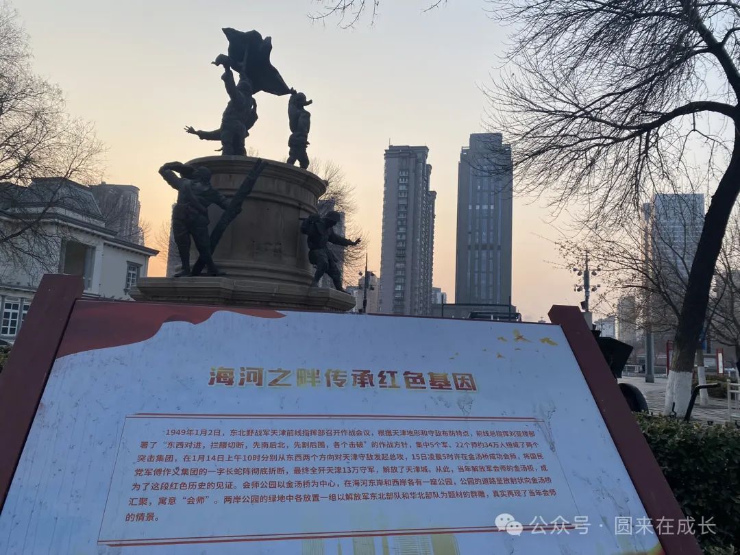 从海河上的解放桥步行回去,天津解放桥又称万国桥,俗称法国桥、法俄桥,是海河跨桥中仅剩的三座可开启的桥之一,桥两侧有天津解放战役的介绍和雕塑,很好的红色文化主题教育。
