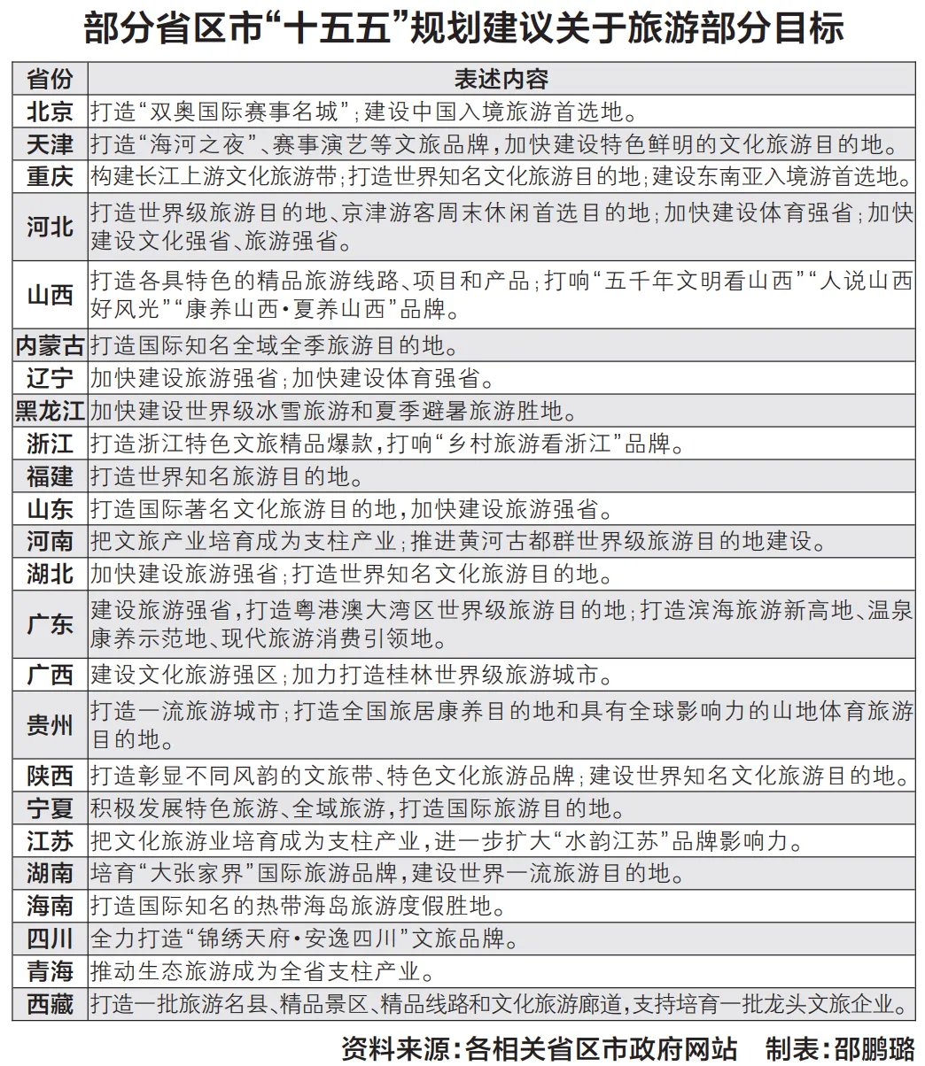 “十五五”规划建议提出,推进旅游强国建设,丰富高品质旅游产品供给,提高旅游服务质量。提升入境游便利化国际化水平。推进文旅深度融合,大力发展文化旅游业,以文化赋能经济社会发展。近期,各省份陆续发布“十五五”规划建议,纵览已发布的各省份规划建议,“旅游强国”的中央顶层设计在地方蓝图中得到了全面响应与特色化演绎。
