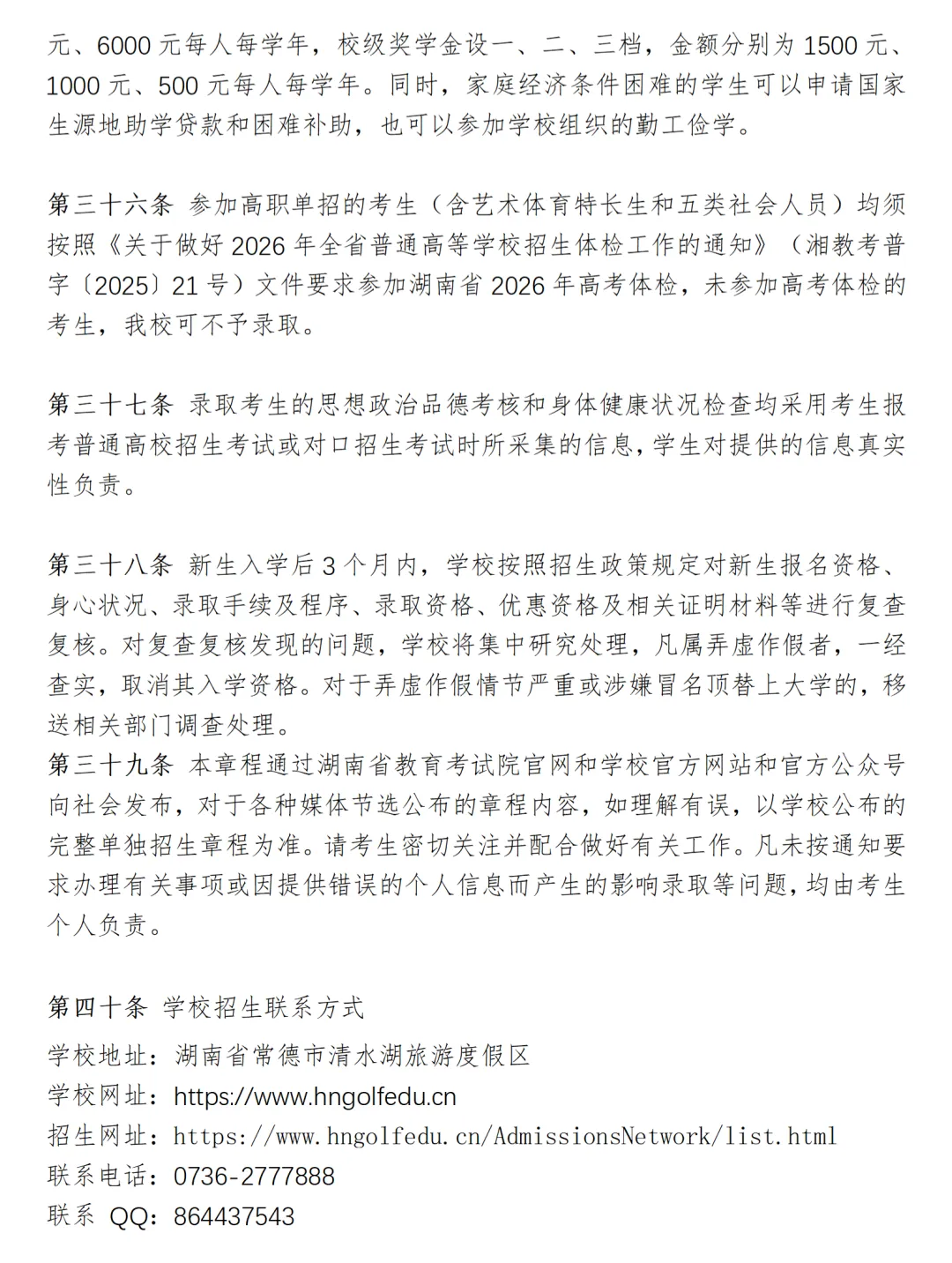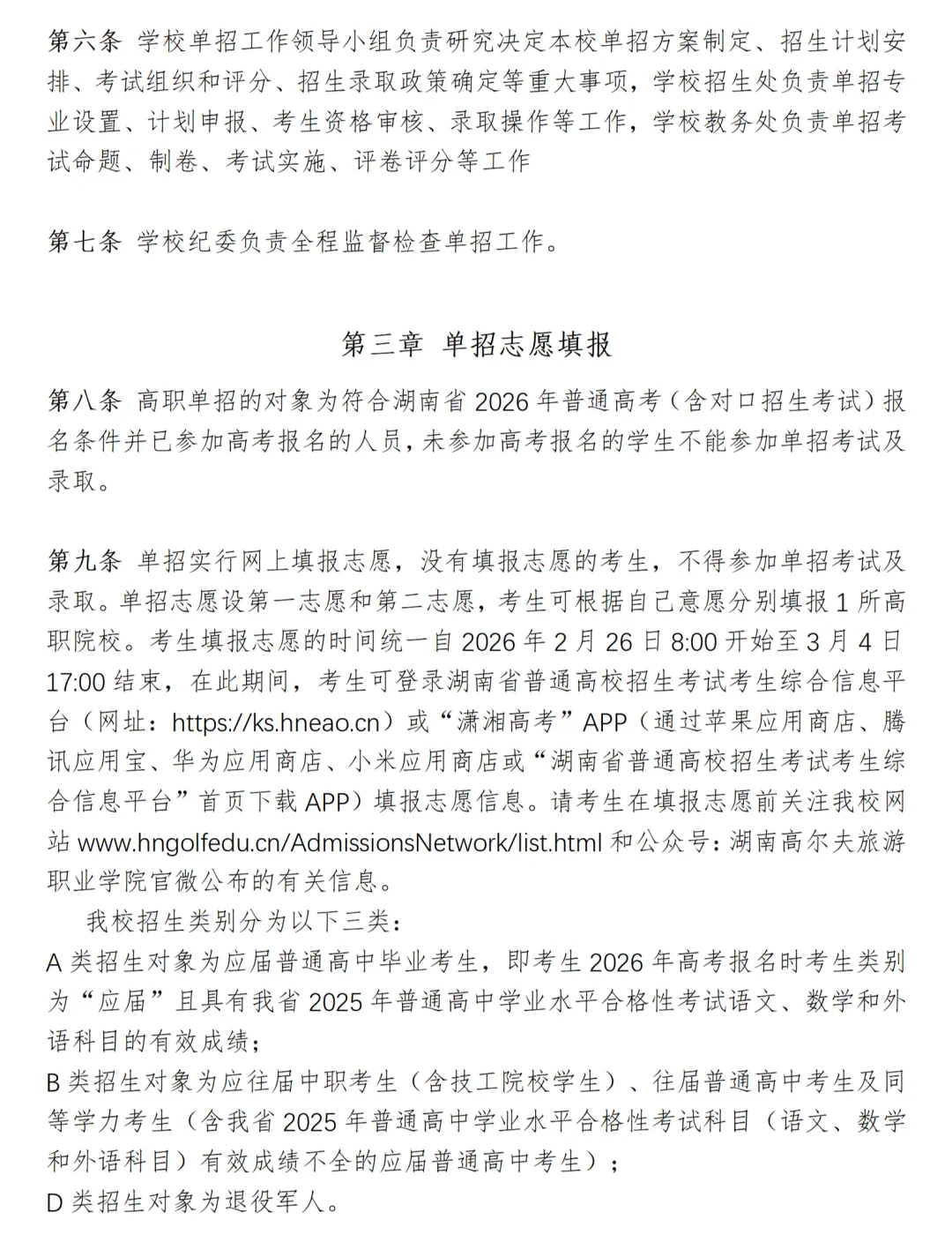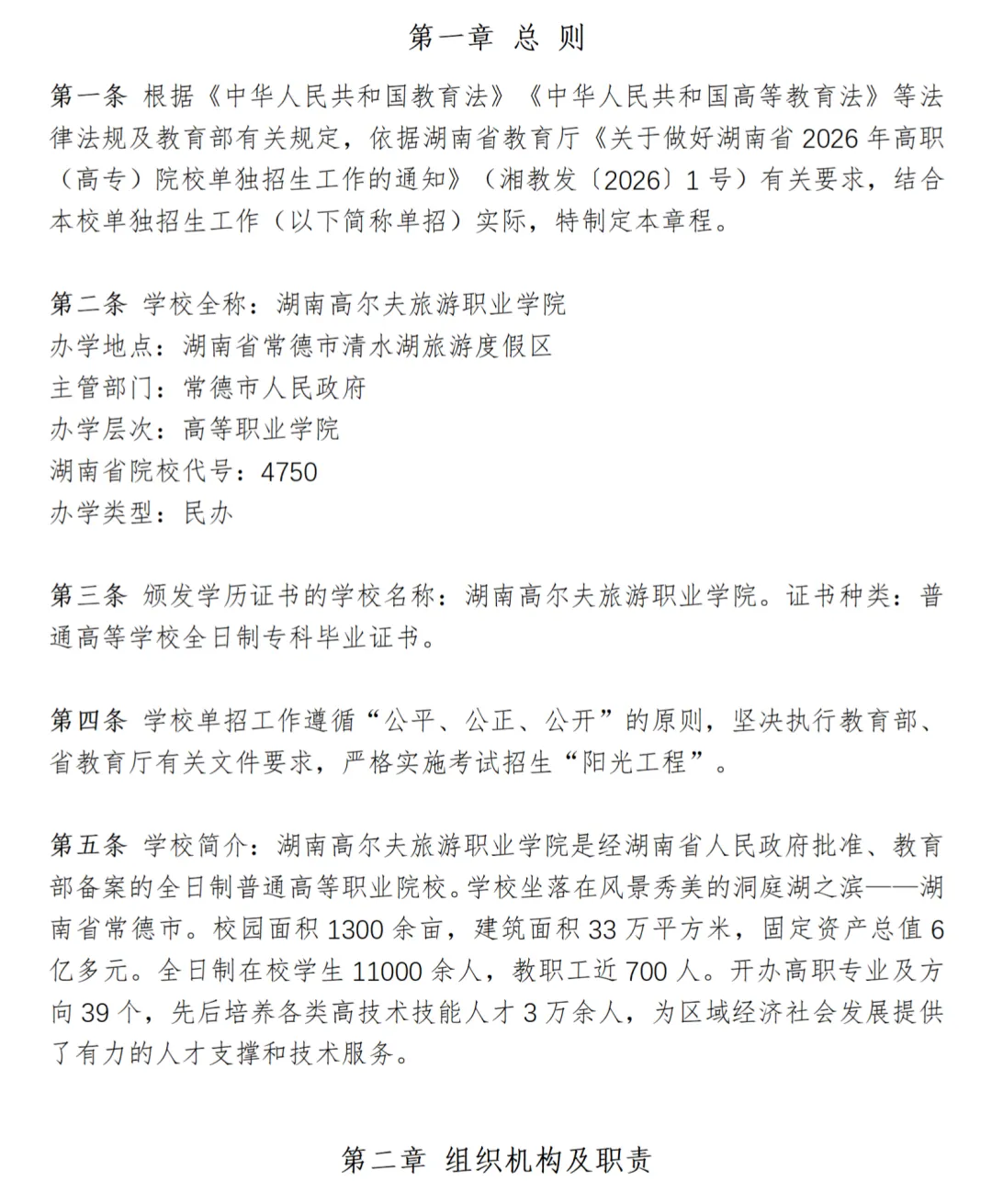 湖南高尔夫旅游职业学院2026年高职单招章程