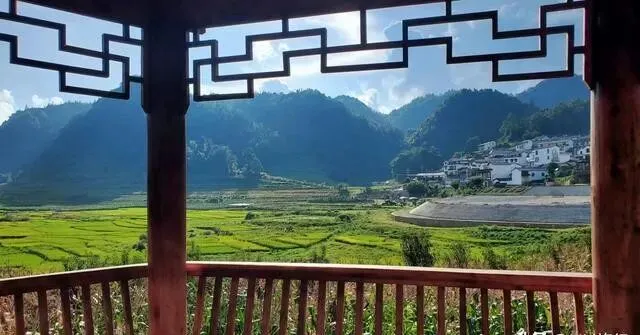 村子在一个小山坳里 , 山腰是房子 , 谷底是整整齐齐的农田 , 还有条徒步线路 , 有个正在开发的溶洞。