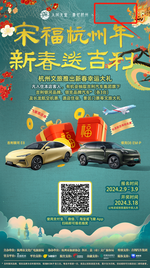 什么?在杭州住酒店(民宿)就能抽汽车?!杭州市文化广电旅游局“宋福杭州年·新春送吉利”文旅促消费活动来啦!2月9日至3月9日期间,入住杭州市域范围内任意酒店(民宿),使用支付宝、微信、淘宝、飞猪等任一APP扫码物料,即可参与抽奖。