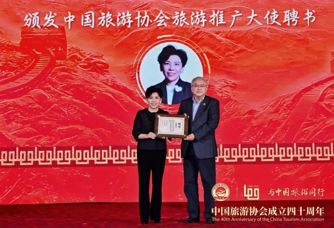 段强会长为奥运冠军邓亚萍颁发中国旅游协会旅游推广大使聘书