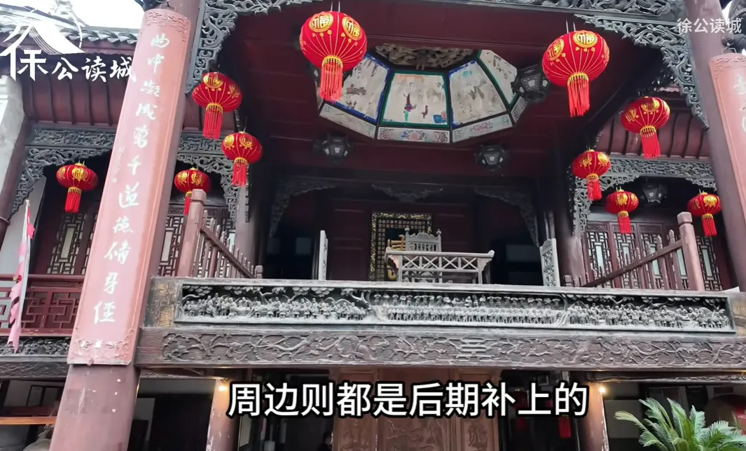它就位于戏台的正面,中间这一段是文物,周边则都是后期补上的。此外戏台的顶端,还有一处很深的藻井,这个结构就是用来增加共鸣的,说明戏台时至如今,仍然是在正常使用的。